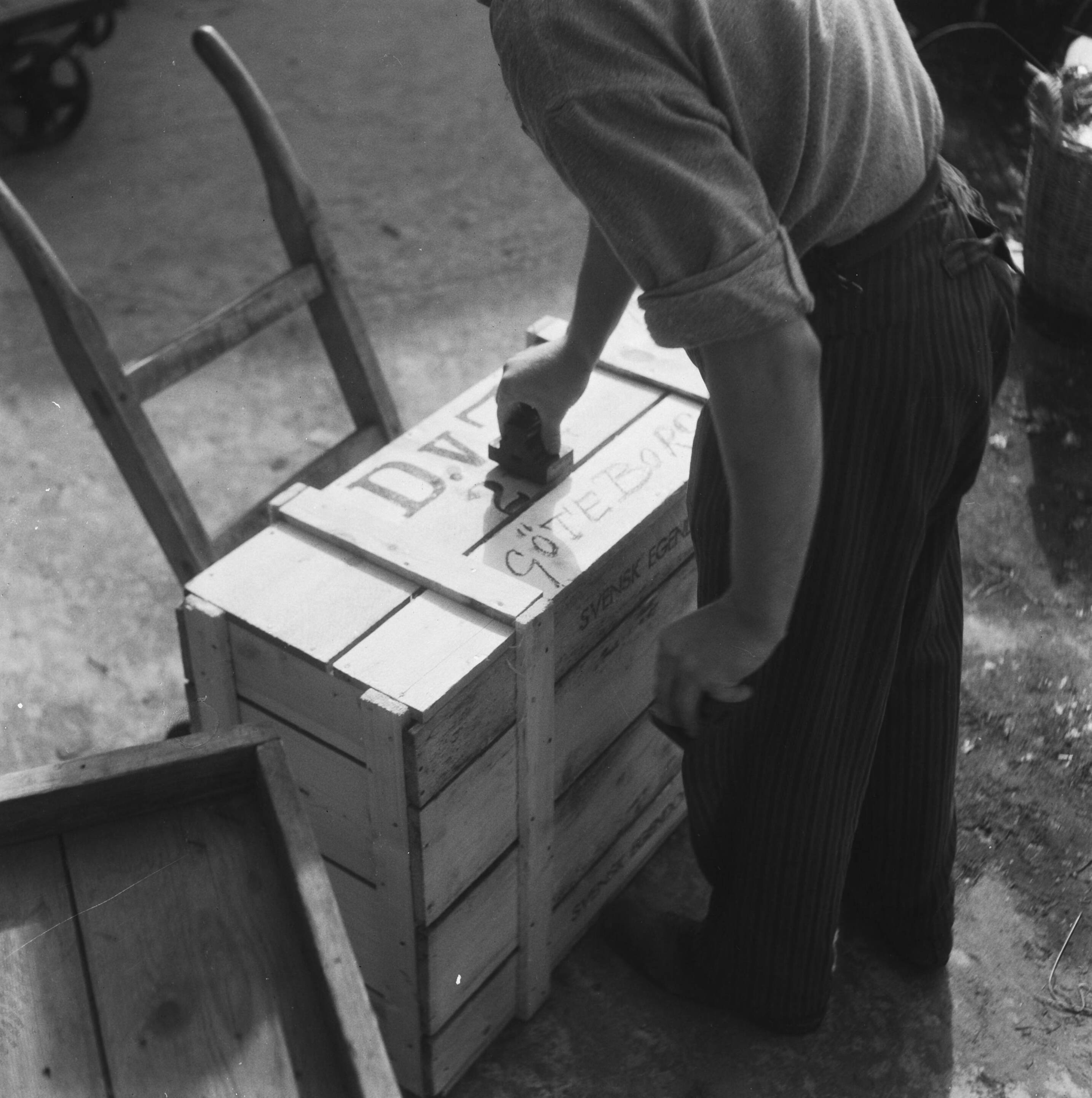 Een kist met bestemming Göteborg wordt bestempeld