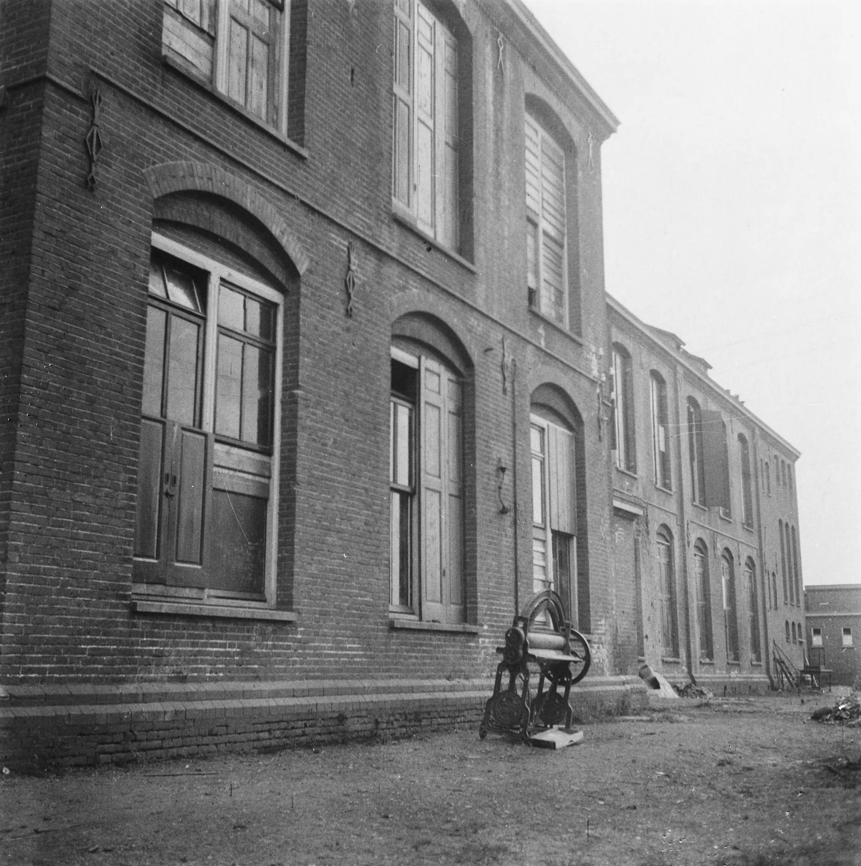 Fabrieksgebouw met dichtgespijkerde ramen