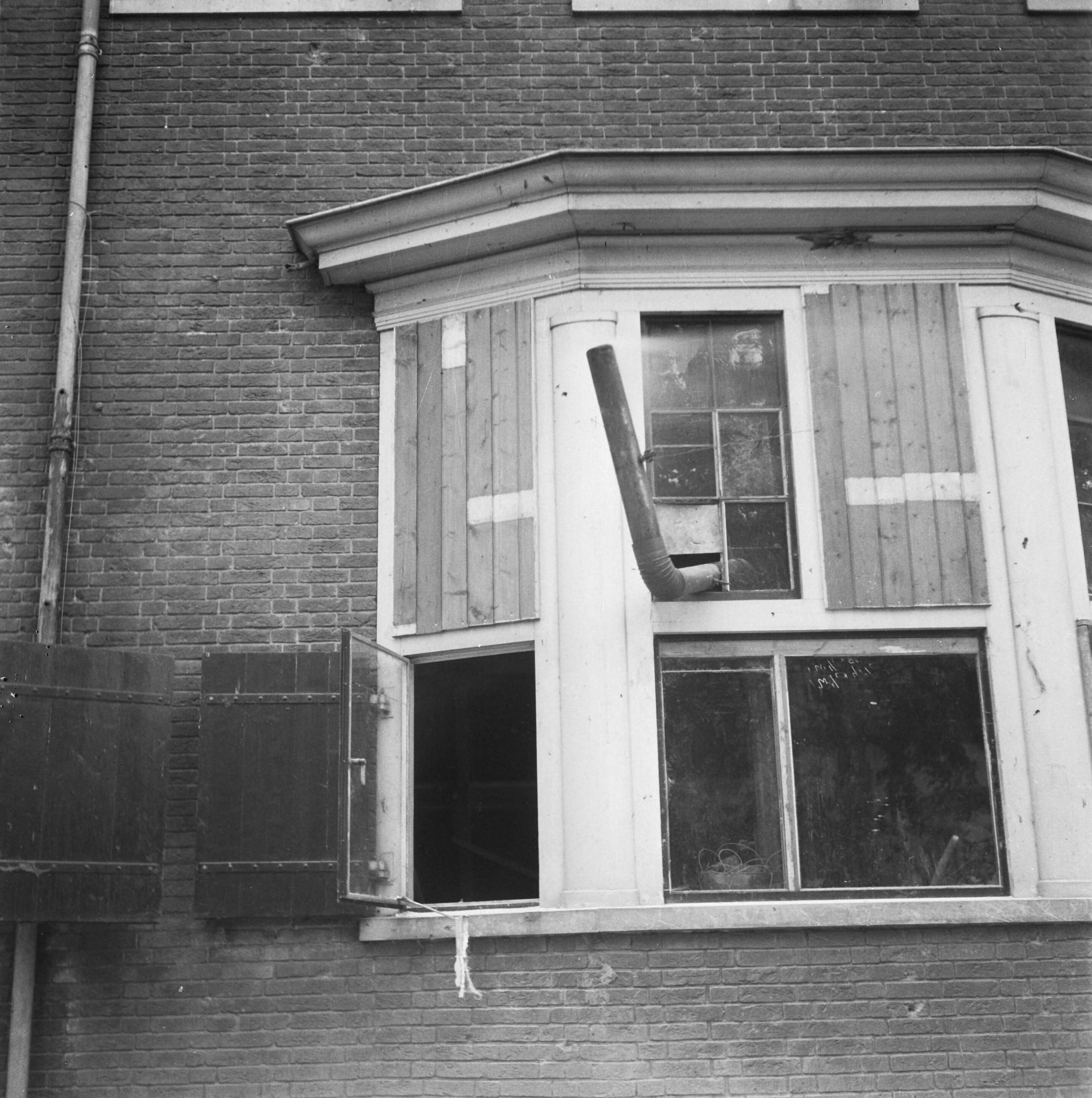 Dichtgespijkerde ramen met tijdelijke schoorsteen