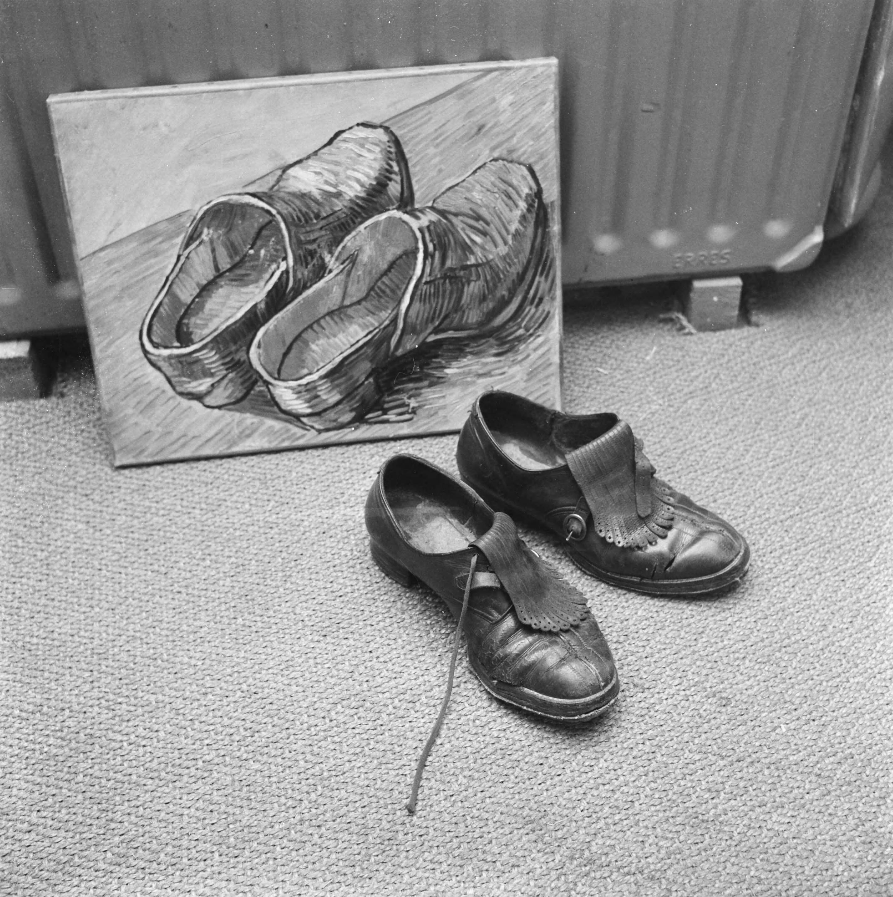 In het Stedelijk Museum te Amsterdam is de Vincent van Gogh tentoonstelling geopend. Schoenen van een werkster van het museum voor een doek van Van Gogh, waarop schoenen te zien zijn