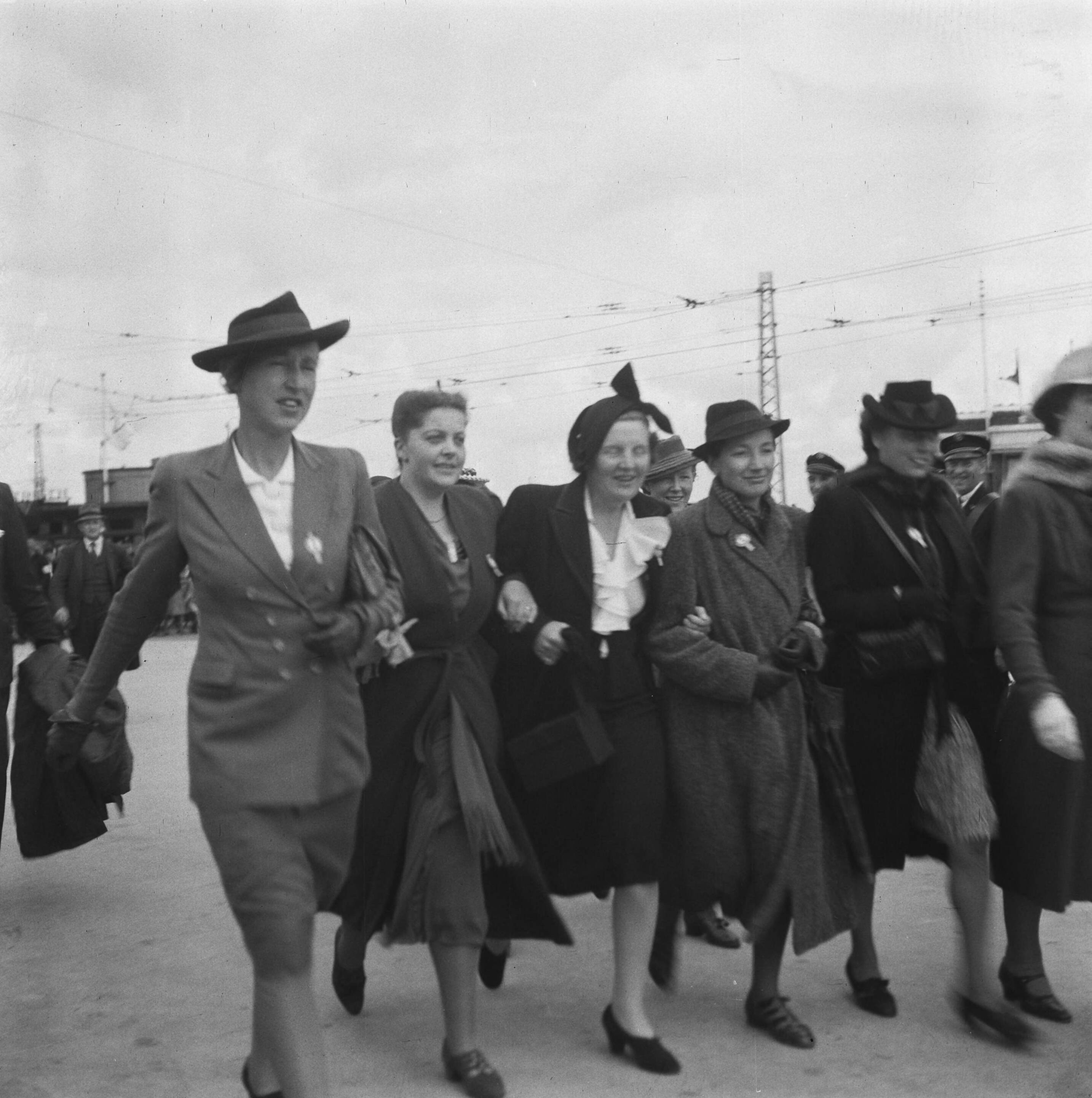 Prinses Juliana loopt gearmd met andere vrouwelijke studenten van het VVSL