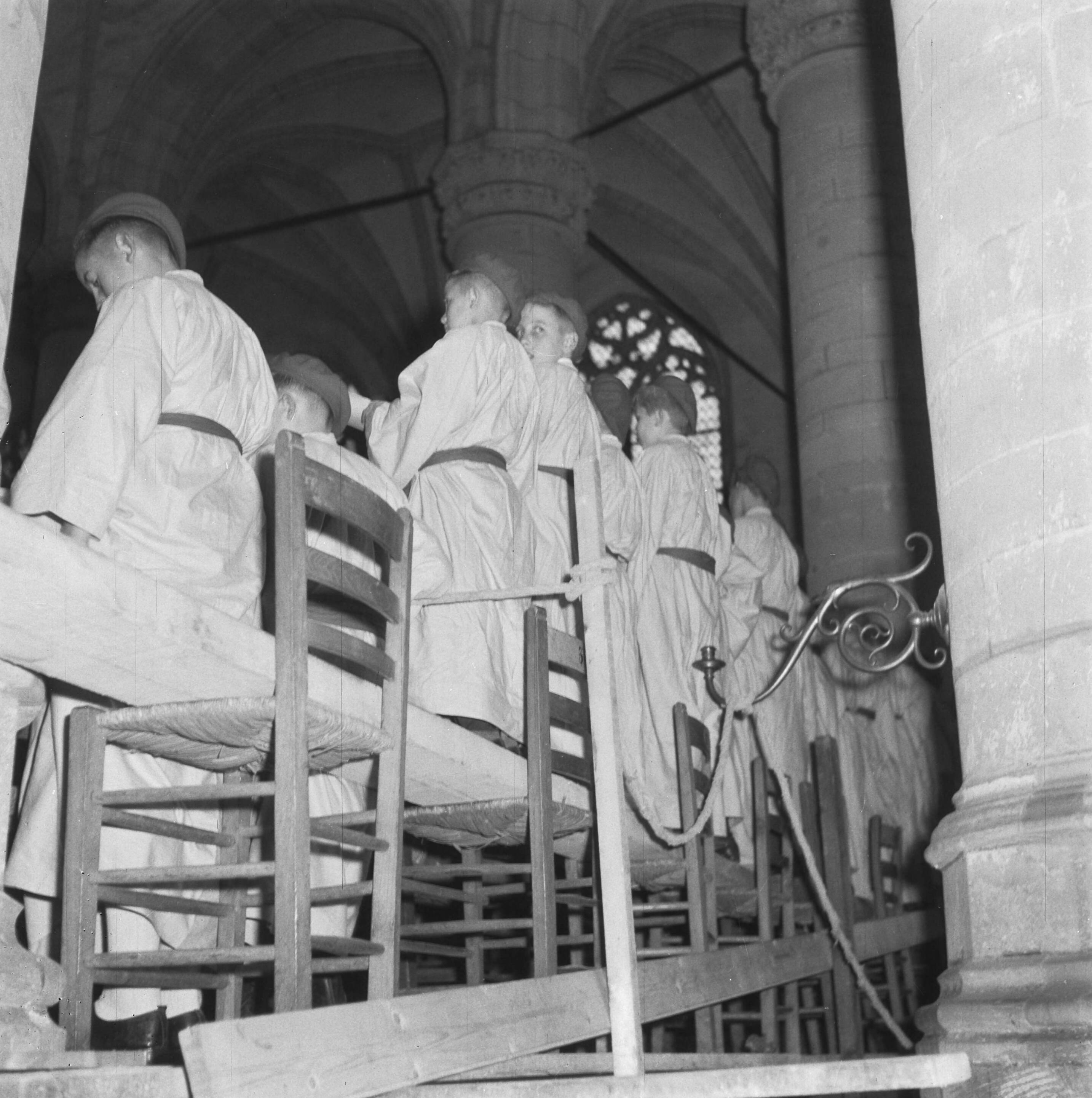 Jongens gekleed in tunieken en met baretten op in de Pieterskerk?
