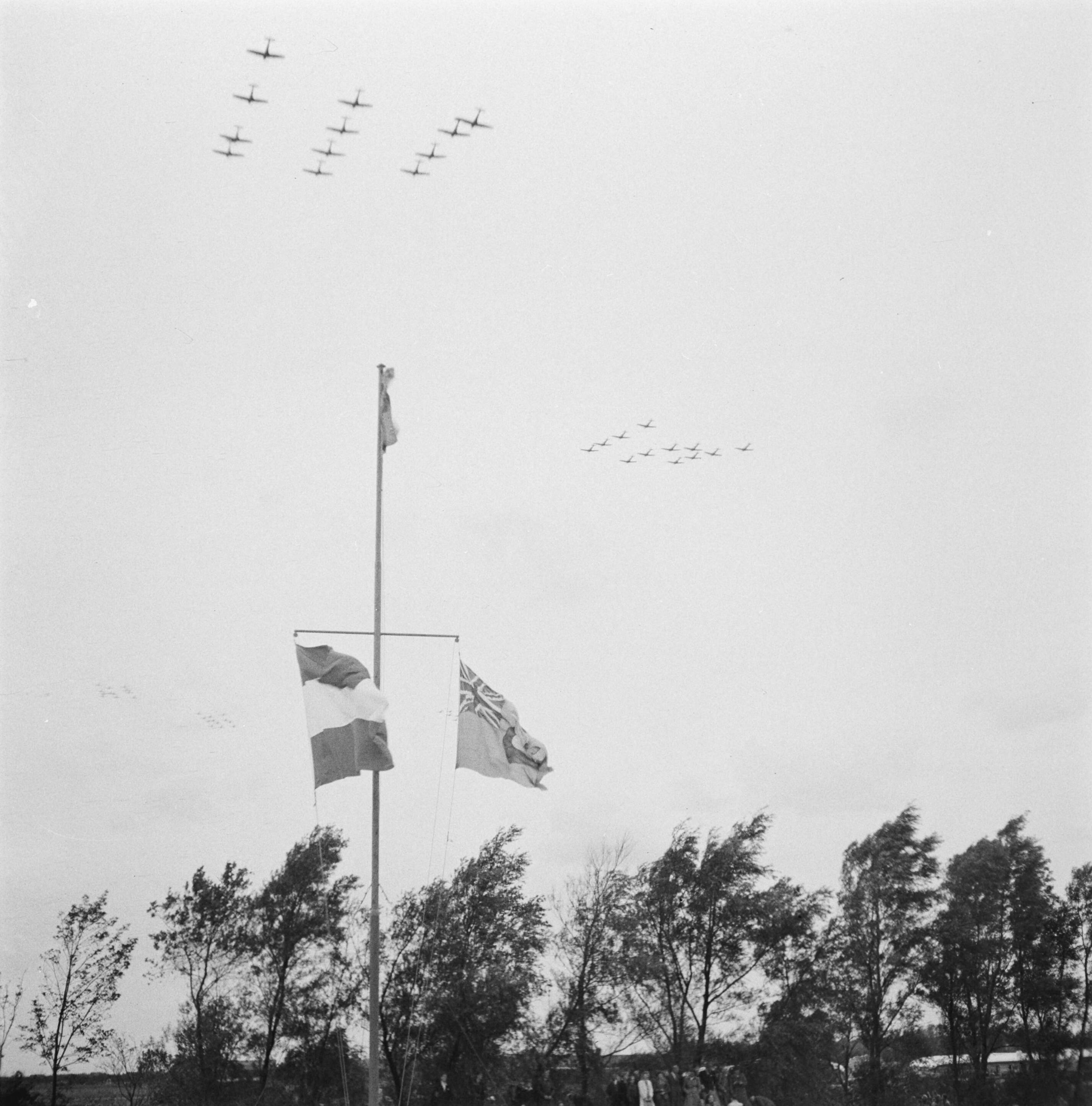 Luchtvaarttoernooi van de RAF ter herdenking van de Battle of Britain. Vliegtuigen in formatie vliegen over