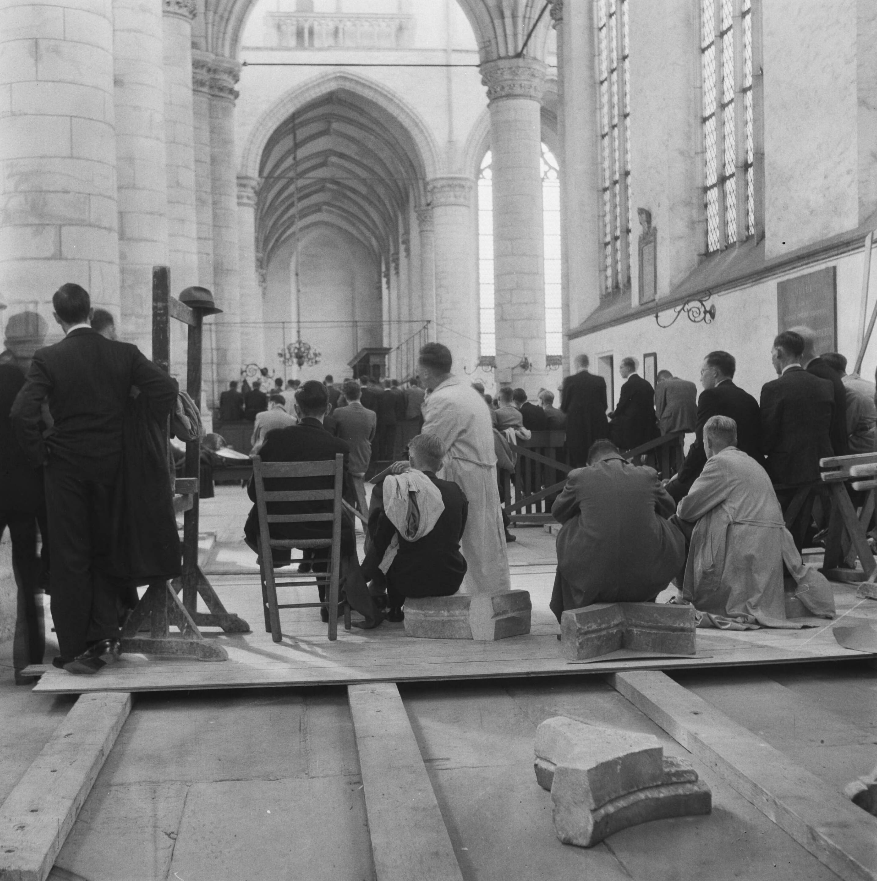 Publiek in de Hooglandse Kerk. Sommige gezeten op brokstukken