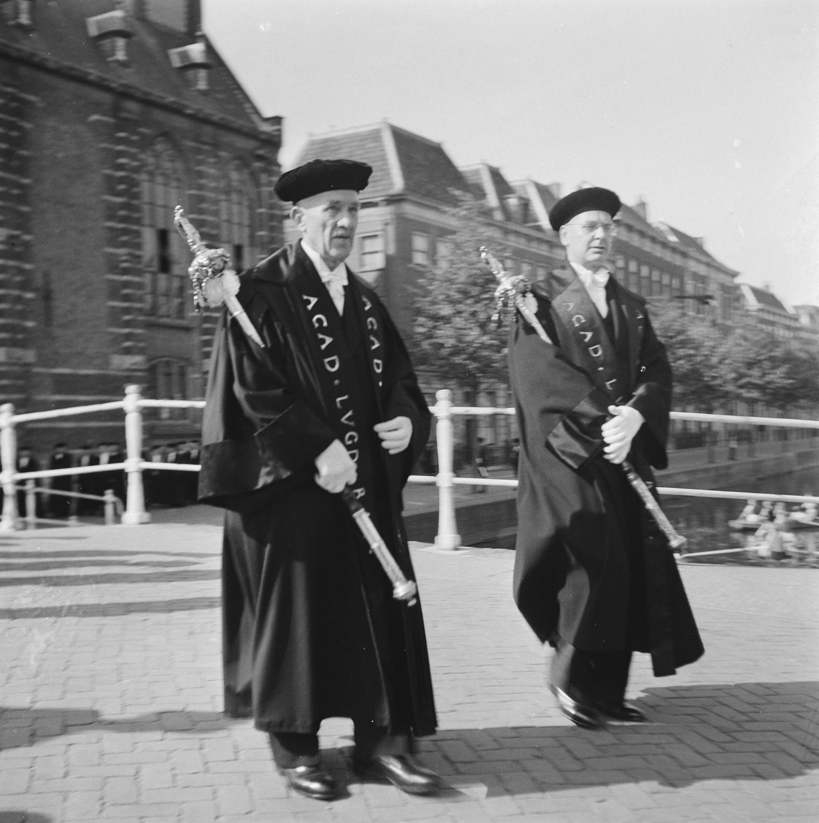 Twee pedels lopen over de brug over het Rapenburg bij het Academiegebouw