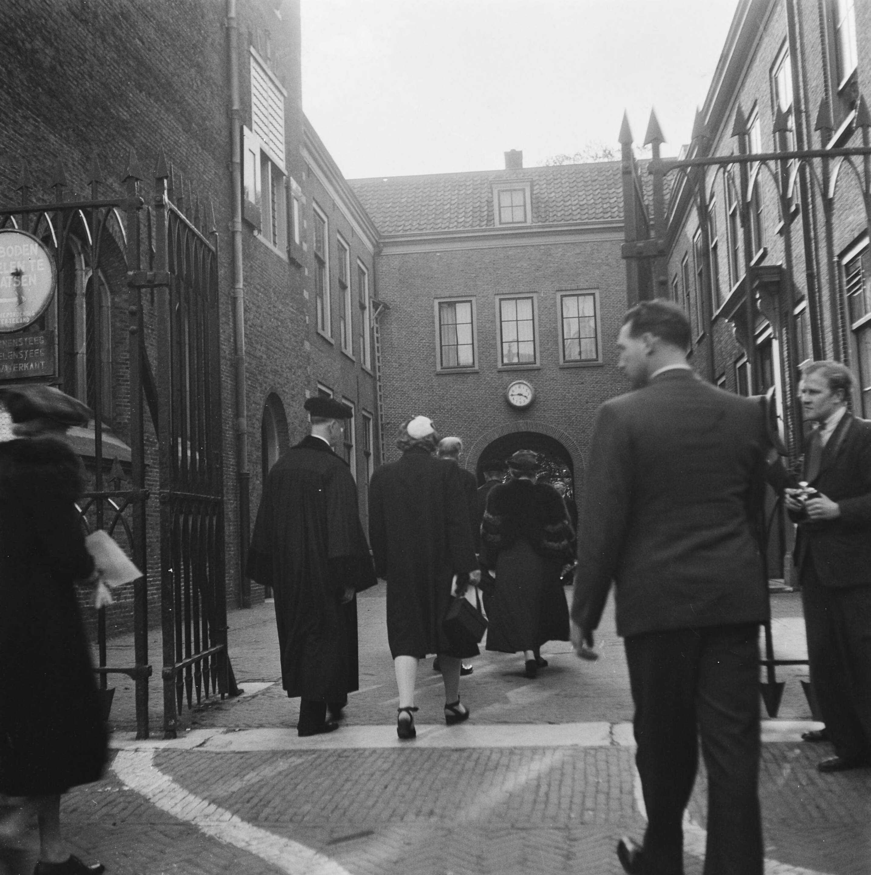 Koningin Wilhelmina en prinses Juliana betreden ingang Hortus Botanicus