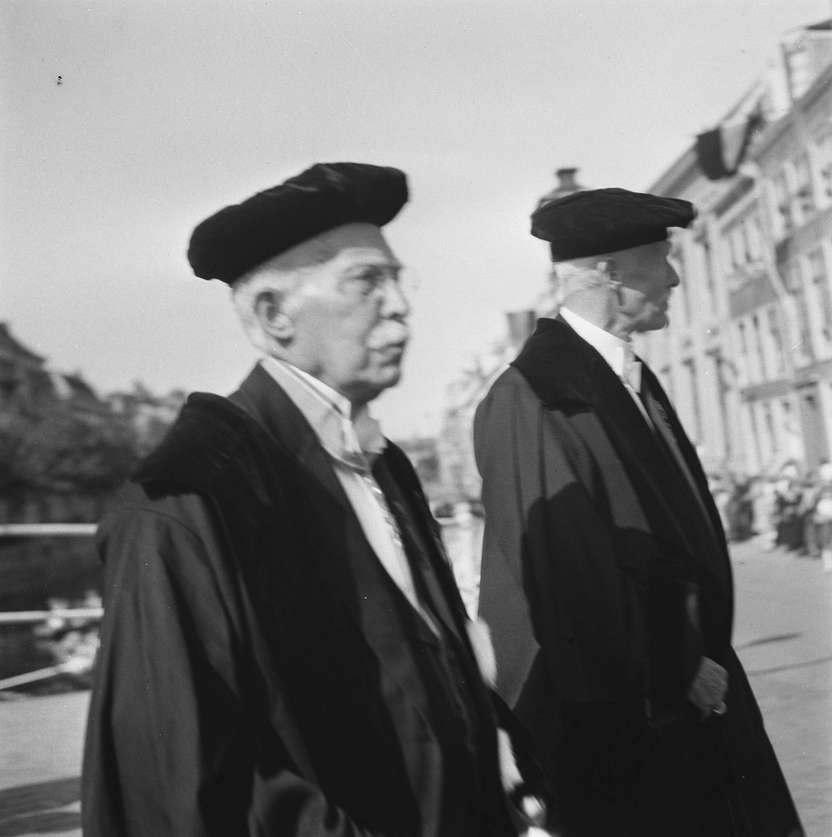 Stoet hoogleraren op weg naar Pieterskerk vanuit het Academiegebouw. Twee hoogleraren