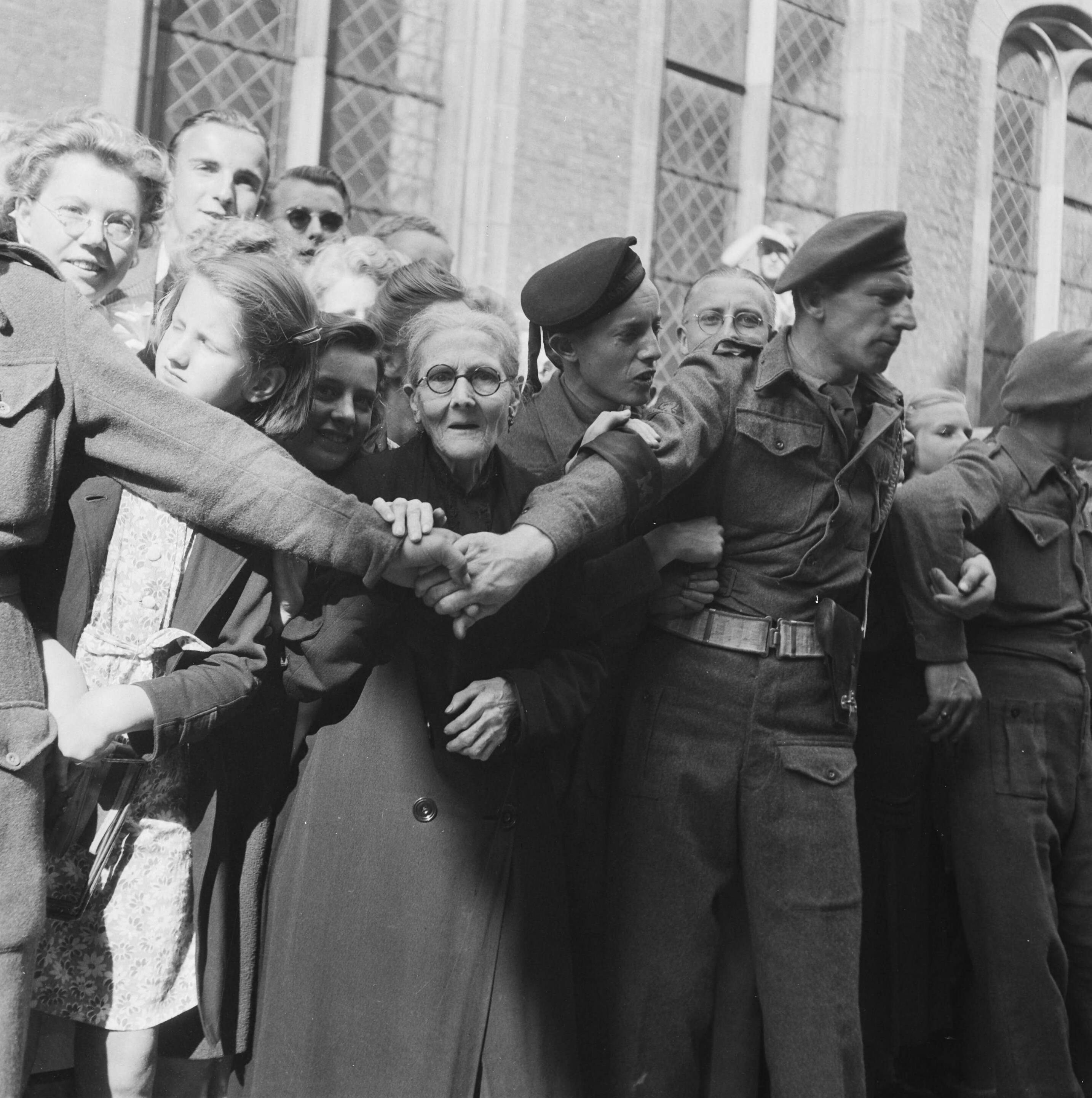 Publiek bij het Academiegebouw wordt in bedwang gehouden door militairen.