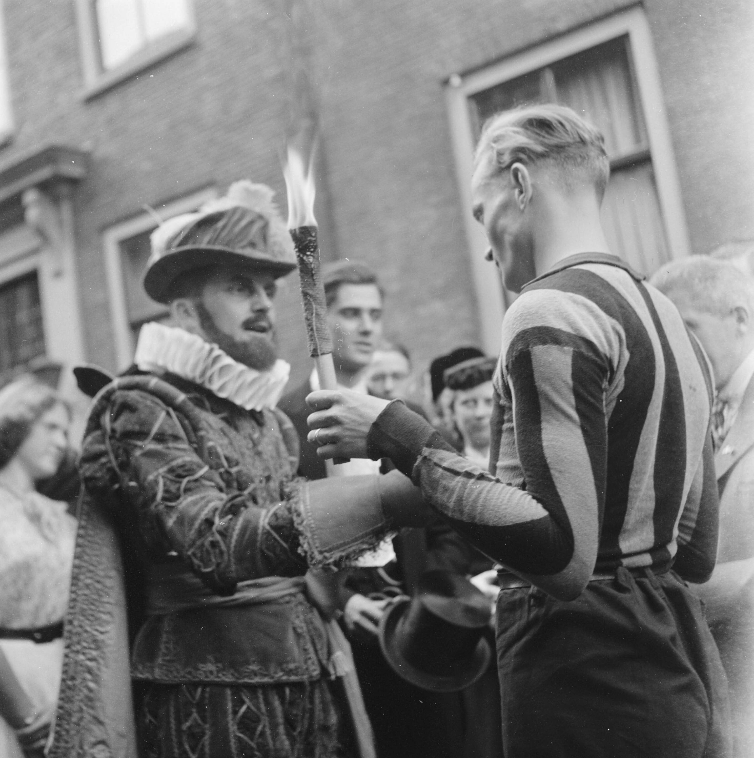 "Willem van Oranje" steekt een fakkel aan, die vastgehouden wordt door een man in voetbaltenue