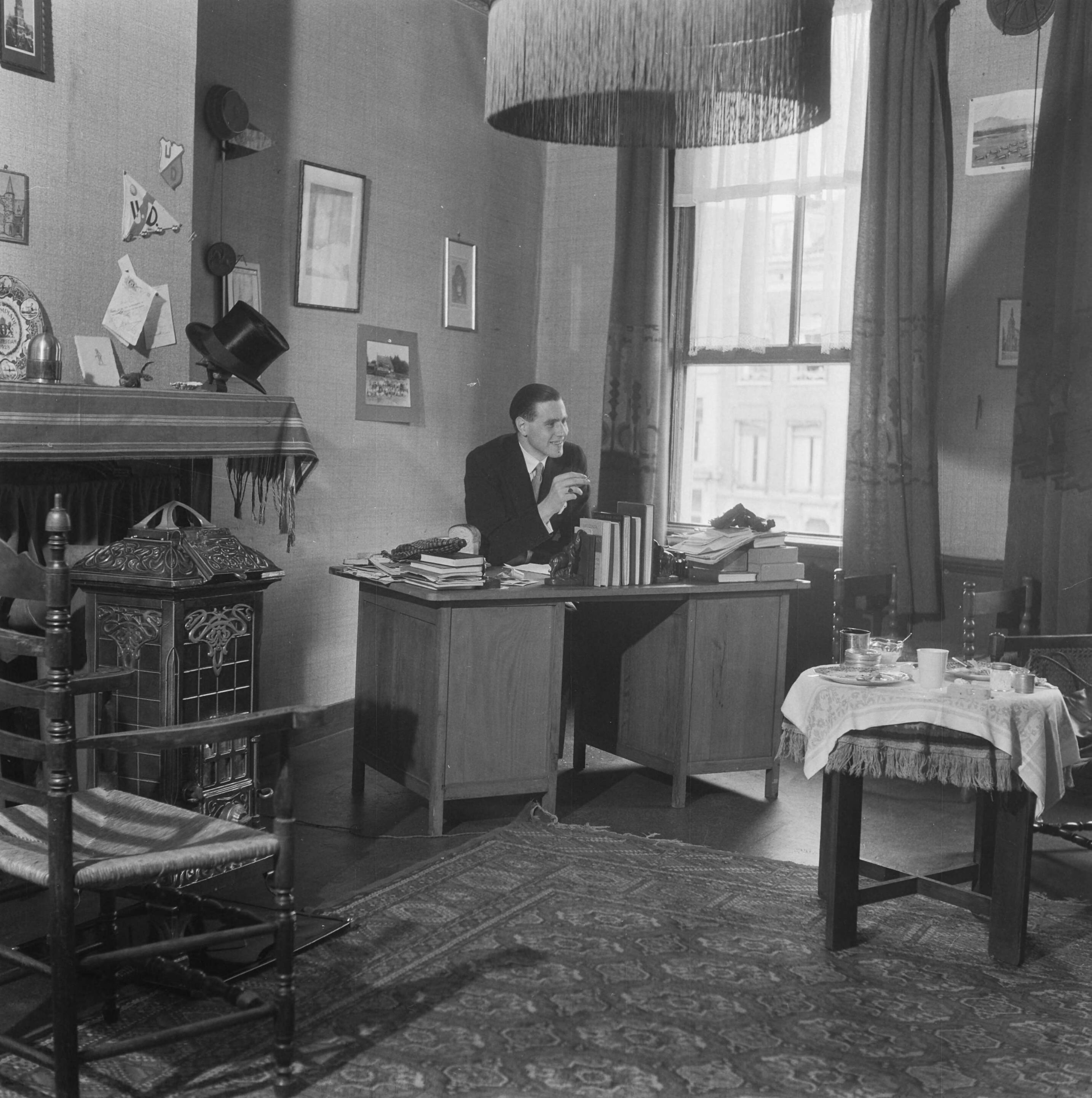 Student achter een bureau in zijn studentenkamer