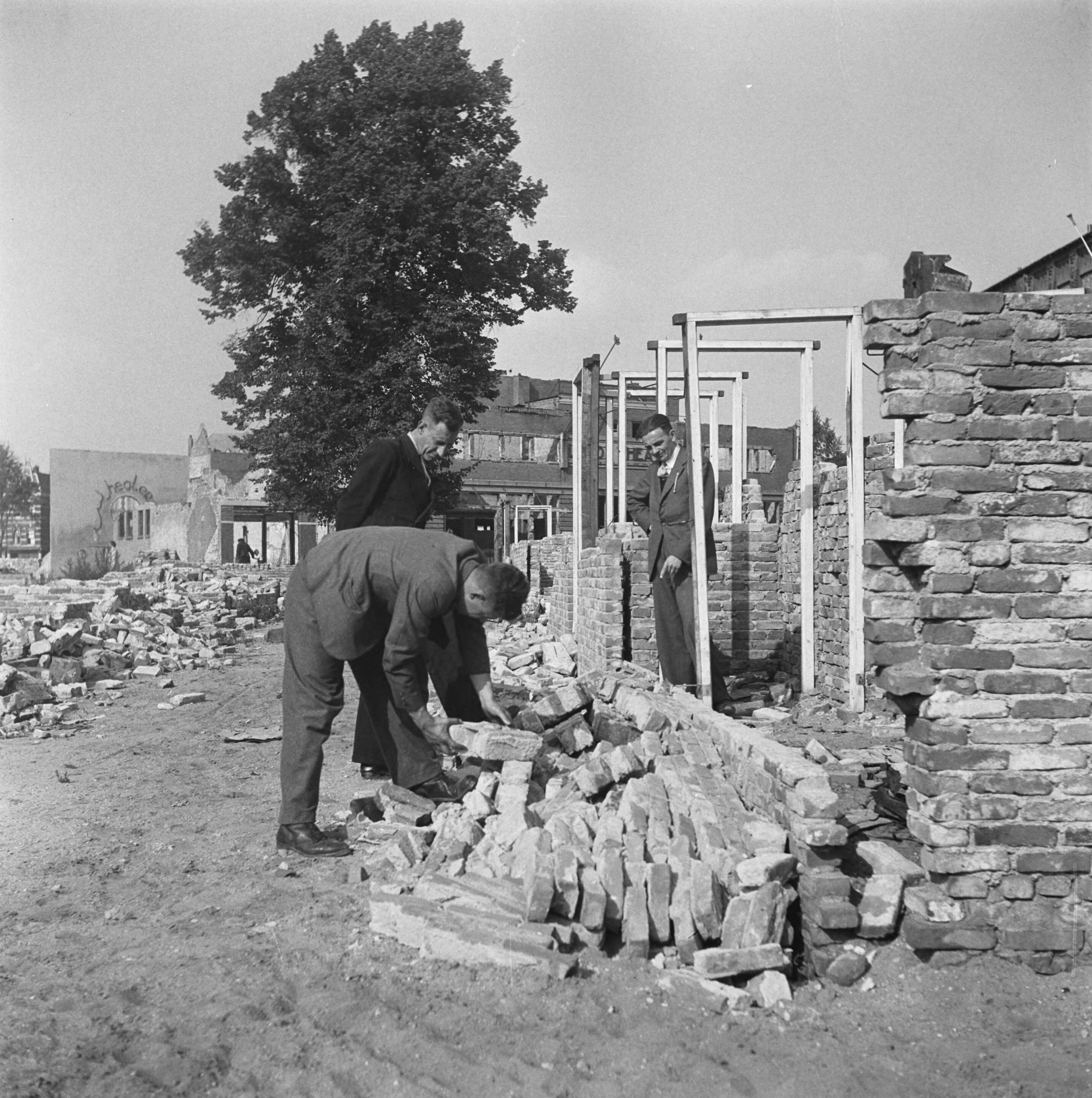 Sorteren van bakstenen uit het puin. Op het gebouw in de achtergrond staat links "theater" en rechts "L...O .HEA"