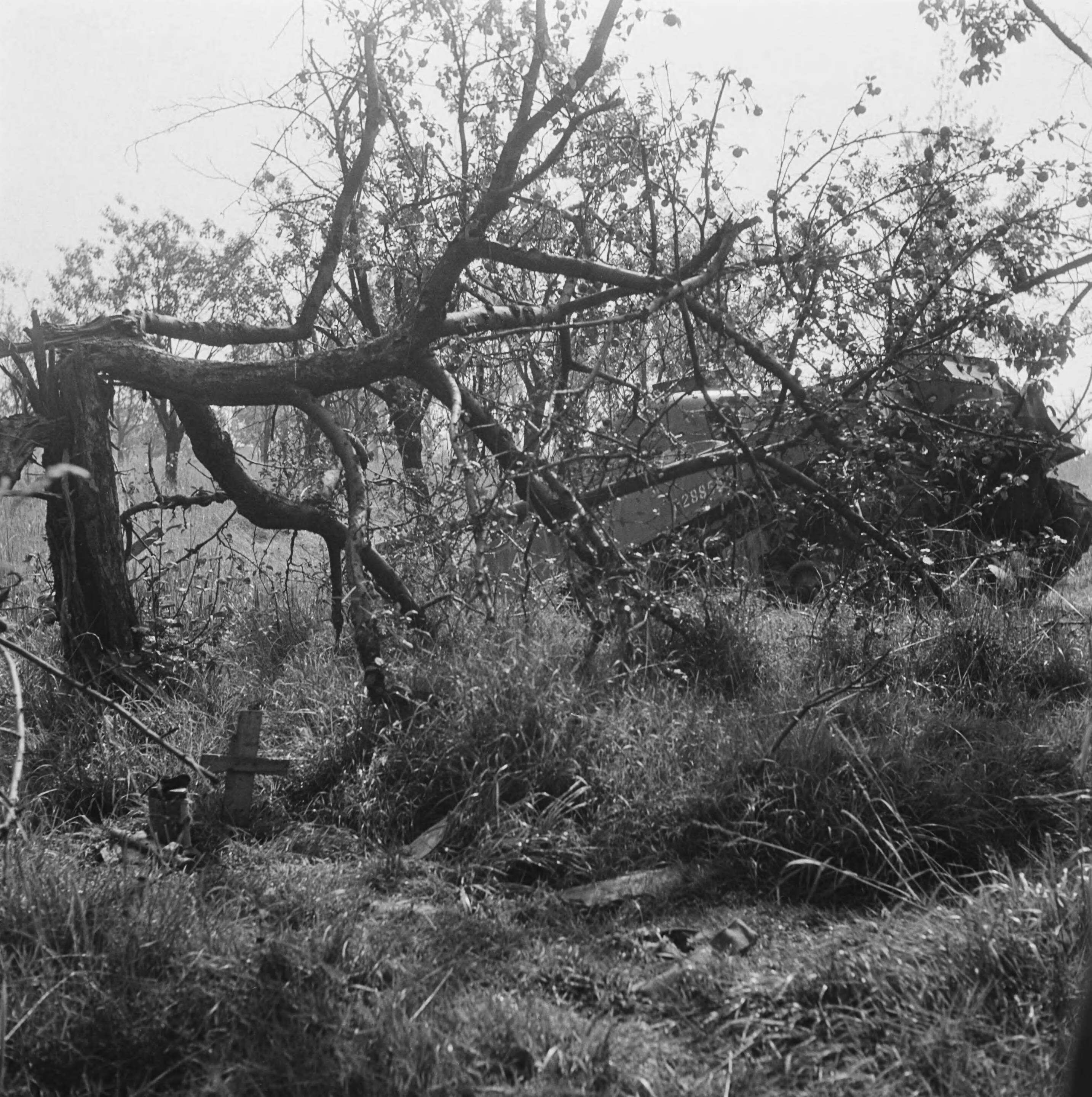 In een deels verwoeste boomgaard is een houten grafkruis te zien