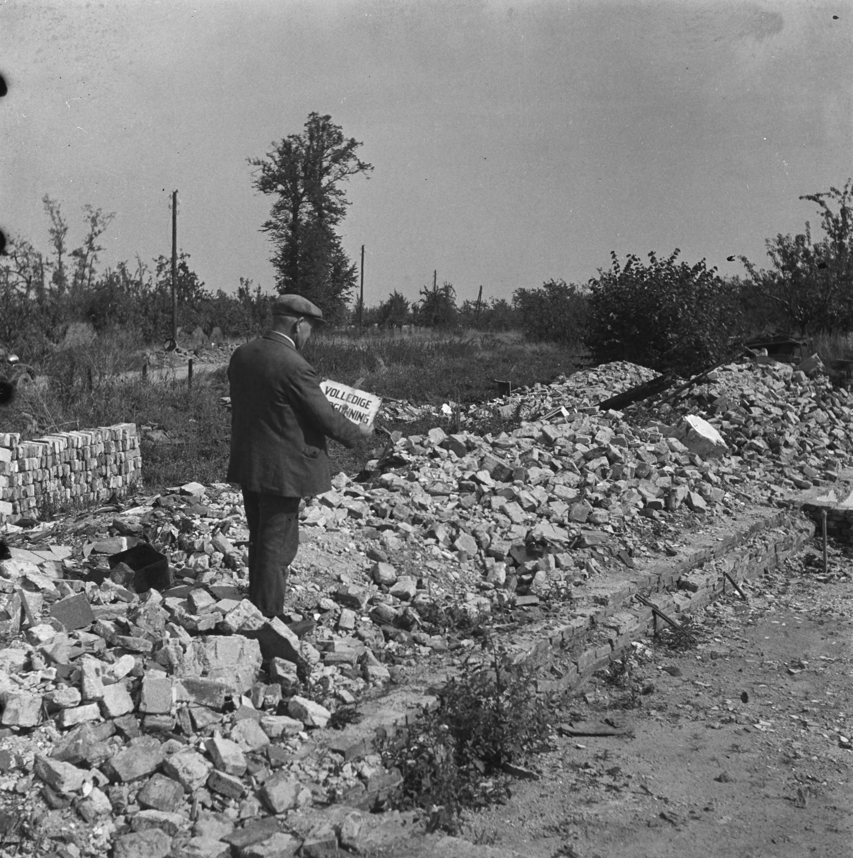 Serie: Noodwoning 7 Man staat op een reep puin. HIj houdt een bord met opschrift "volledige vergunning" in de hand