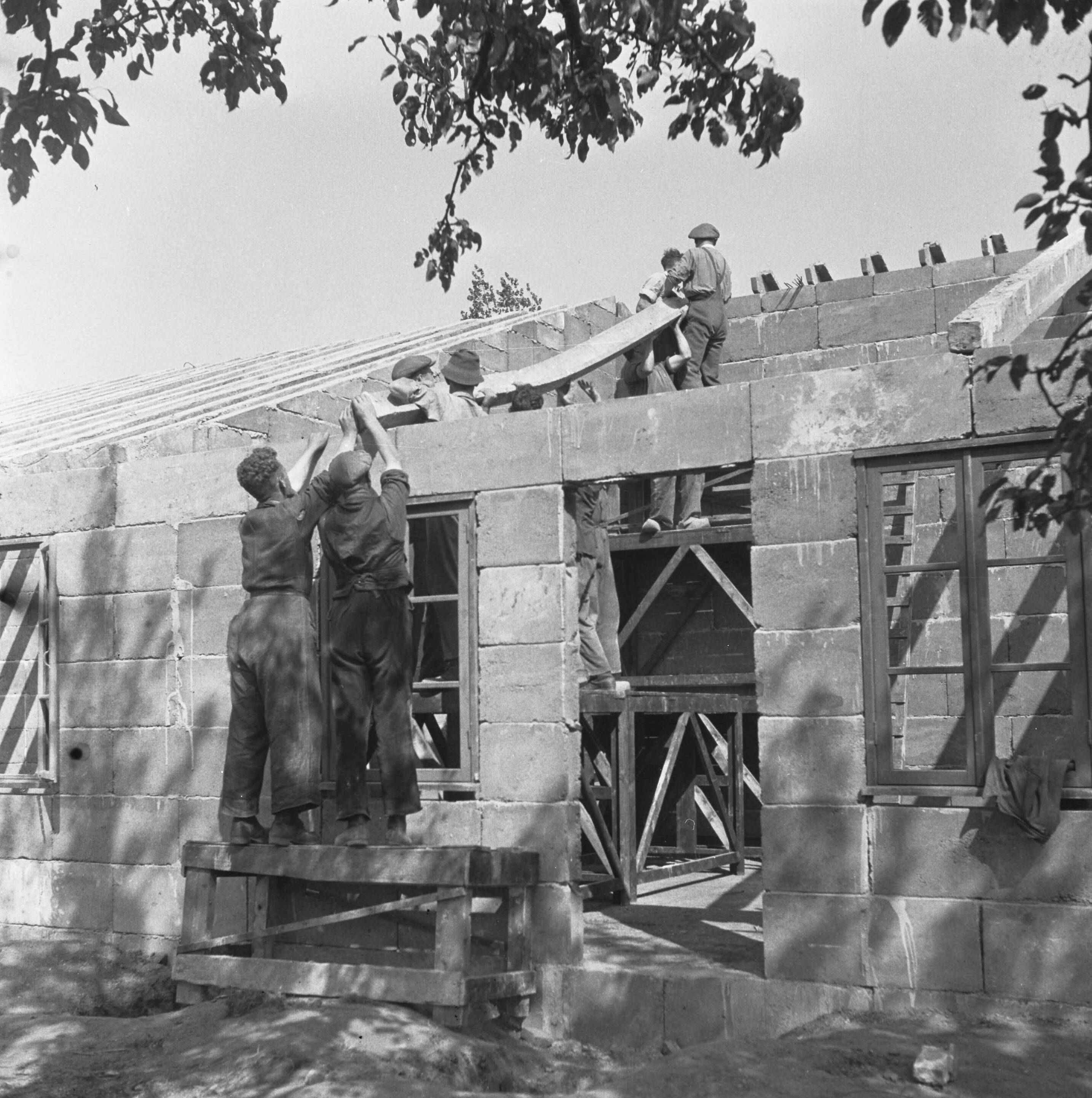 bouwvakkers bezig aan de opbouw van het dak van een noodwoning