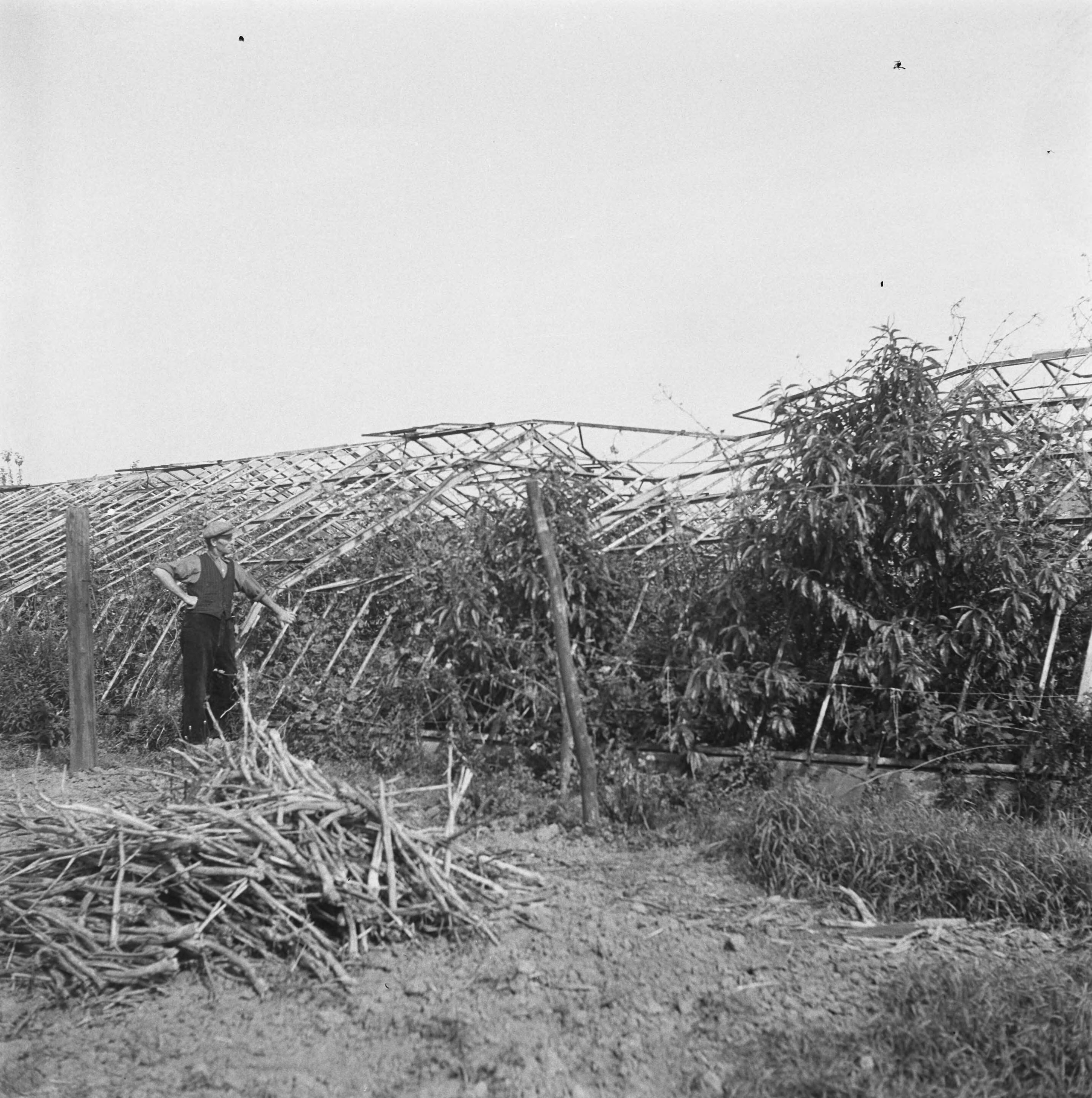 Tuinder staat bij een totaal verwoeste en overwoekerde kas