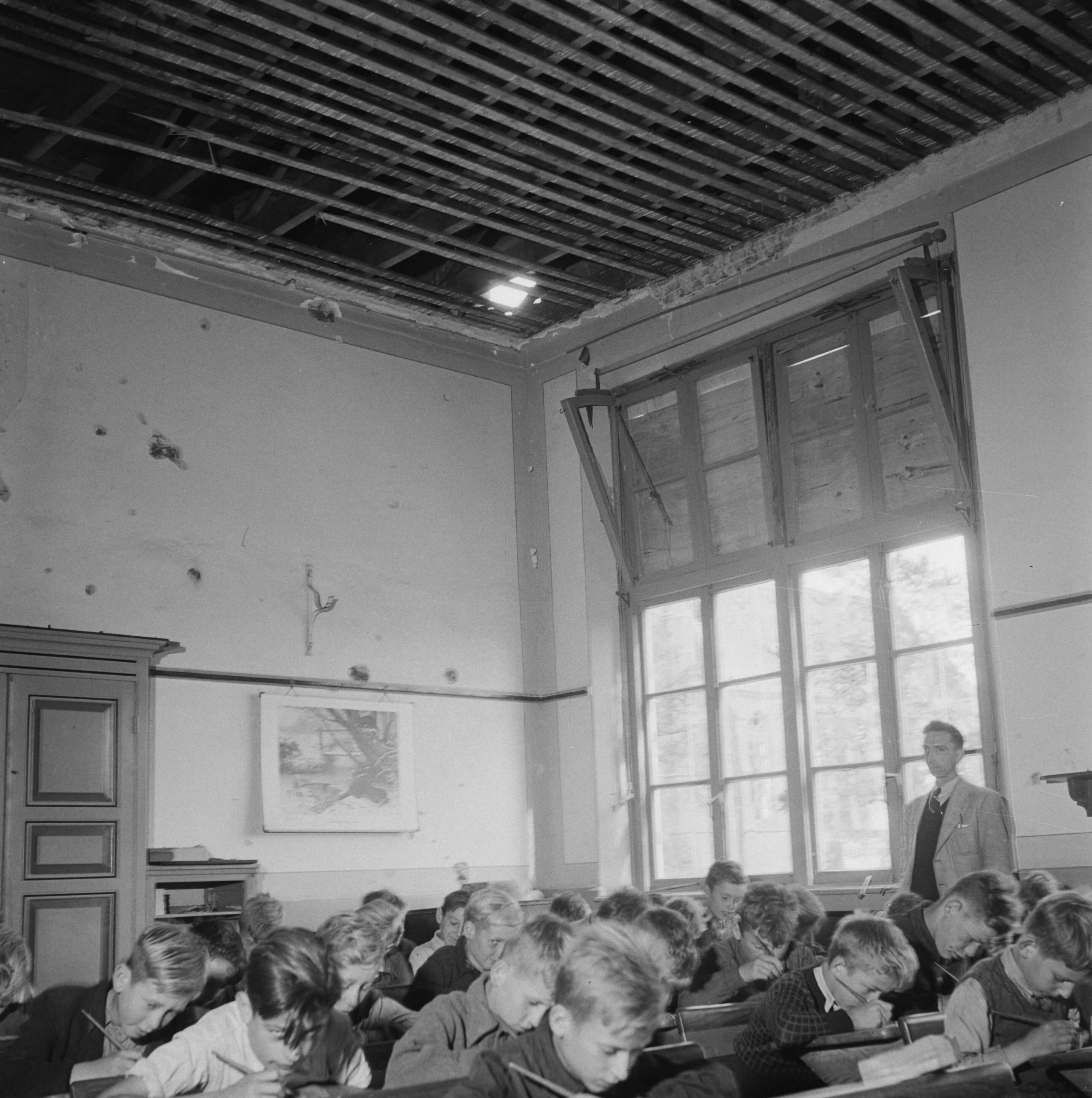 In een schoollokaal waar de oorlogschade nog zichtbaar is, krijgen jongens les van een onderwijzer