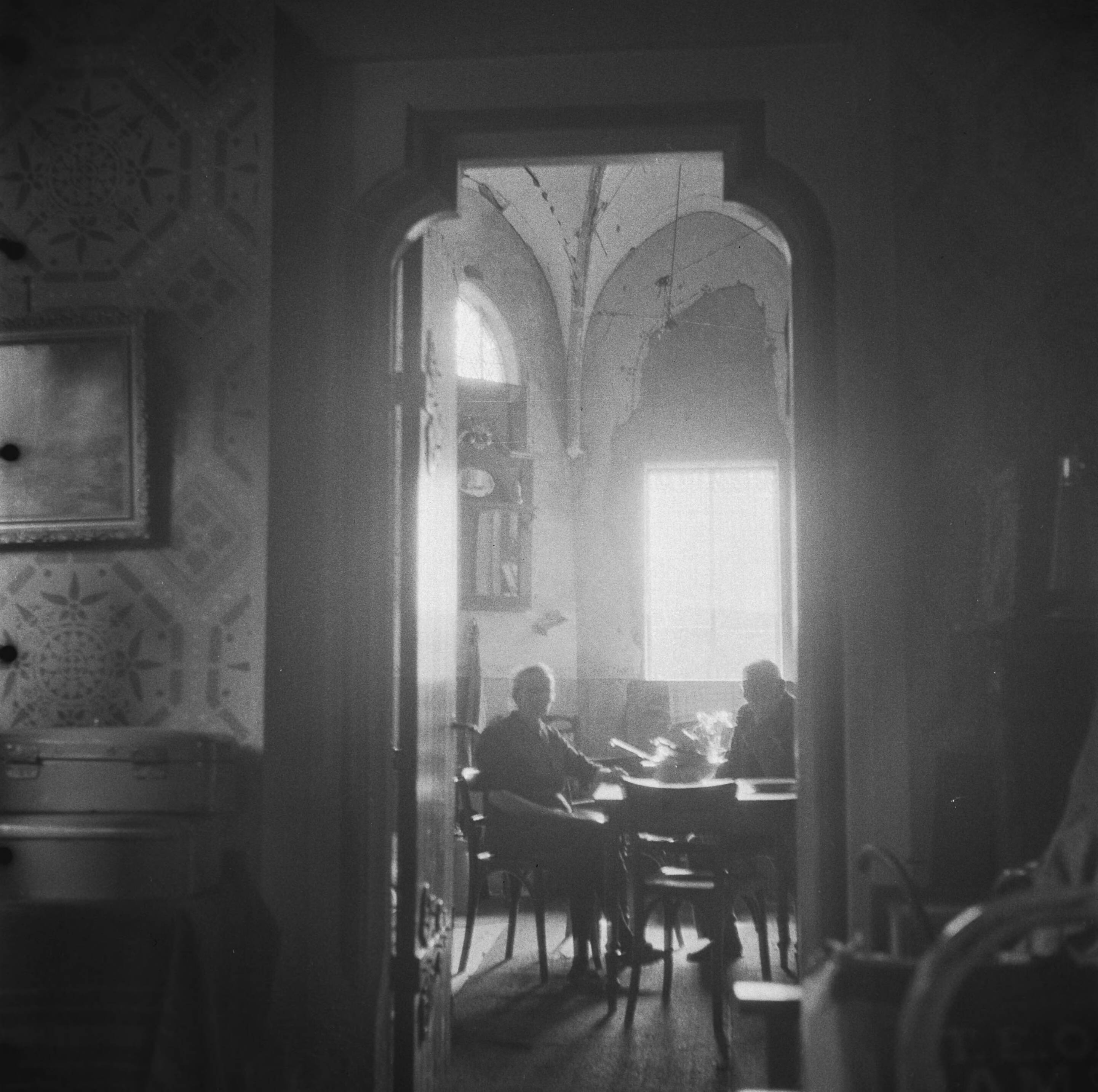 Serie: Noodwoning 11 Doorkijk in een kerk of kapel, dat ingericht is als woonverblijf. Aan tafel zitten twee personen.