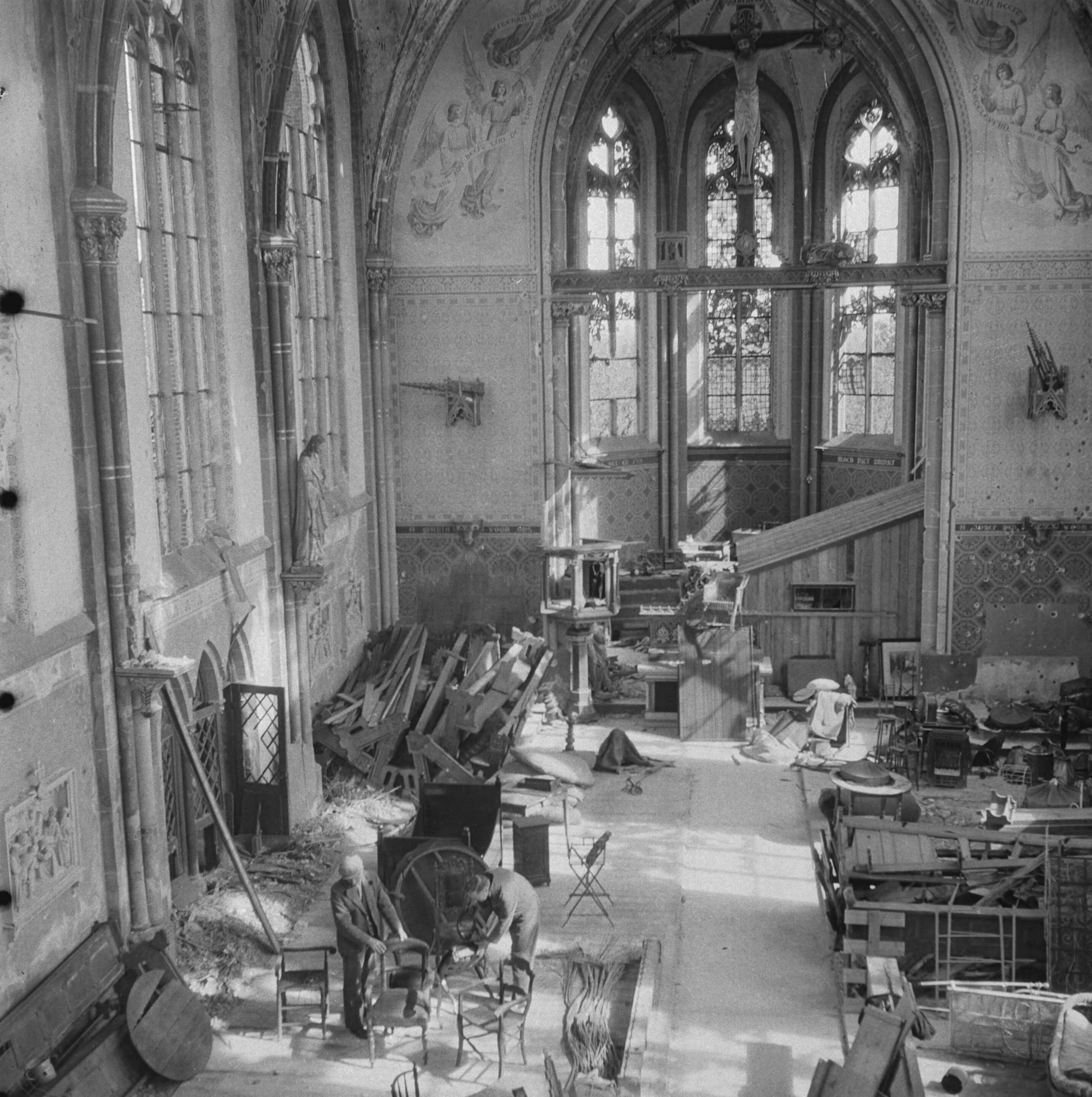 Interieur van de kerk die dienst doet als bergplaats. Twee mannen zijn bezig met stoelen