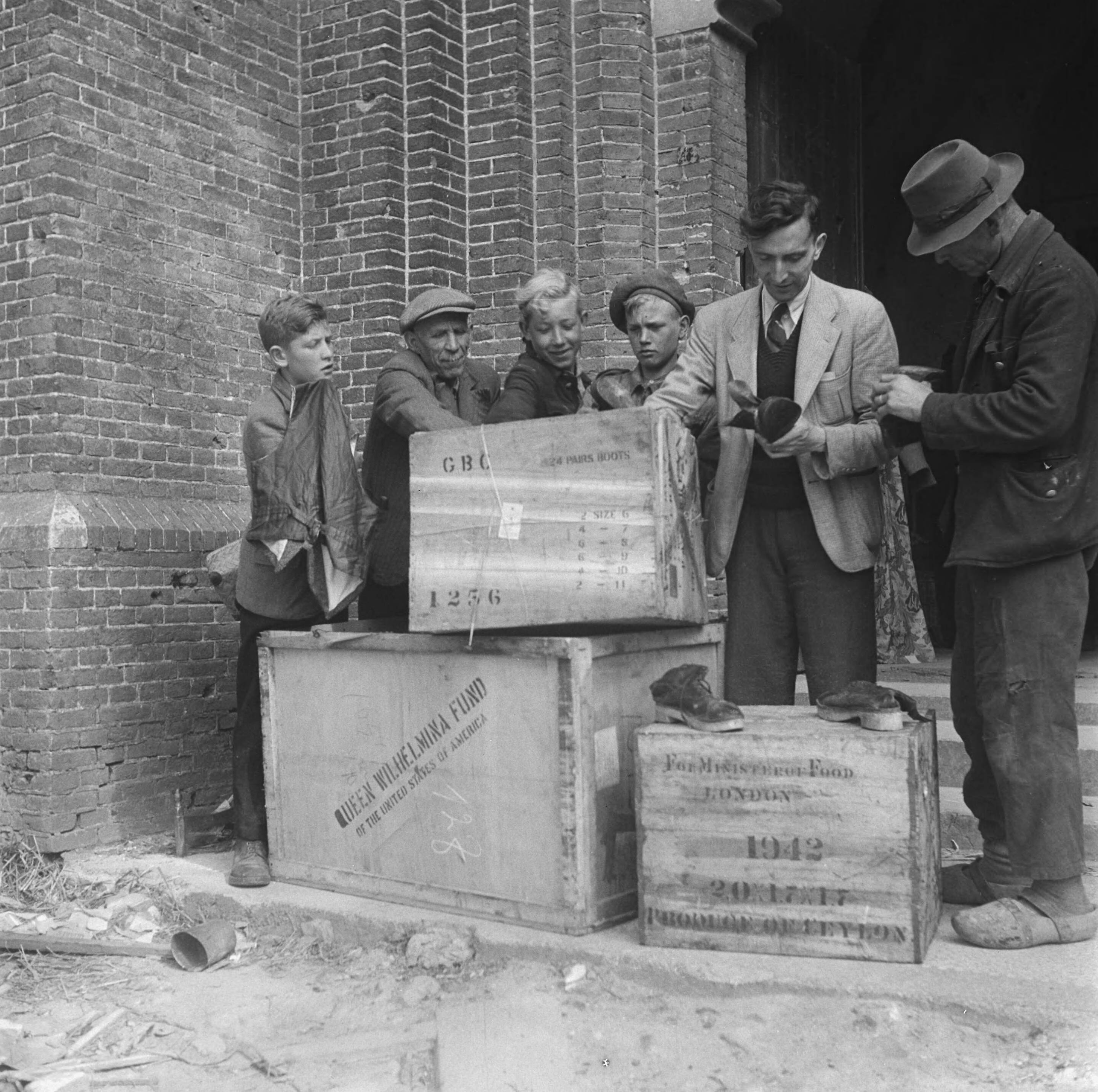 De onderwijzer (zie foto's 900-8074 t/m 900-8076) bekijkt een schoen die afkomstig is uit een van de drie kisten die voor hem staan. Naast hem drie jongens, een oudere man (zie foto's Noodwoning 4), links naast hem bekijkt een andere man de schoenen
