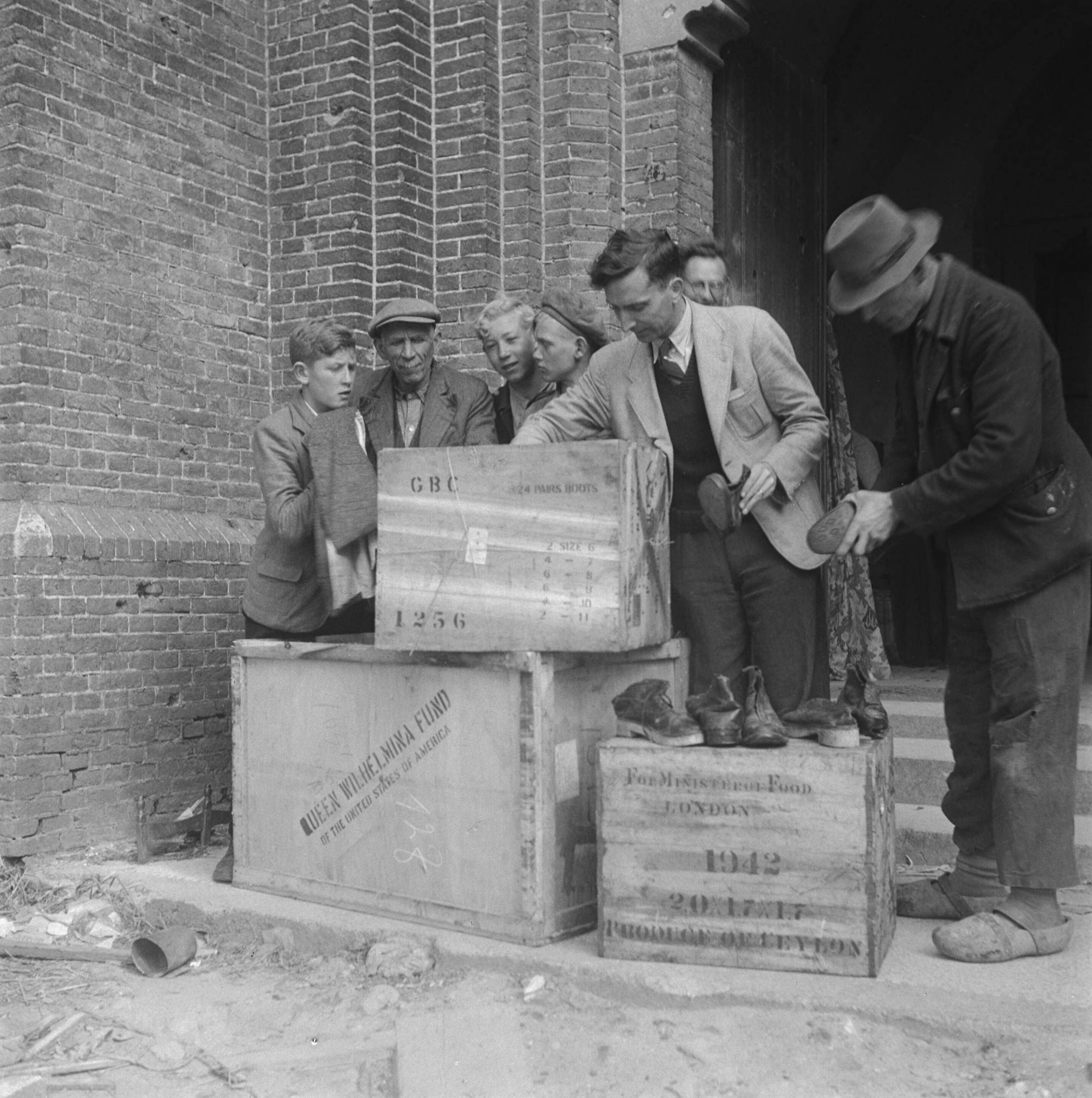 De onderwijzer (zie foto's 900-8074 t/m 900-8076) bekijkt een schoen die afkomstig is uit een van de drie kisten die voor hem staan. Naast hem drie jongens, een oudere man (zie foto's Noodwoning 4), links naast hem bekijkt een andere man de schoenen