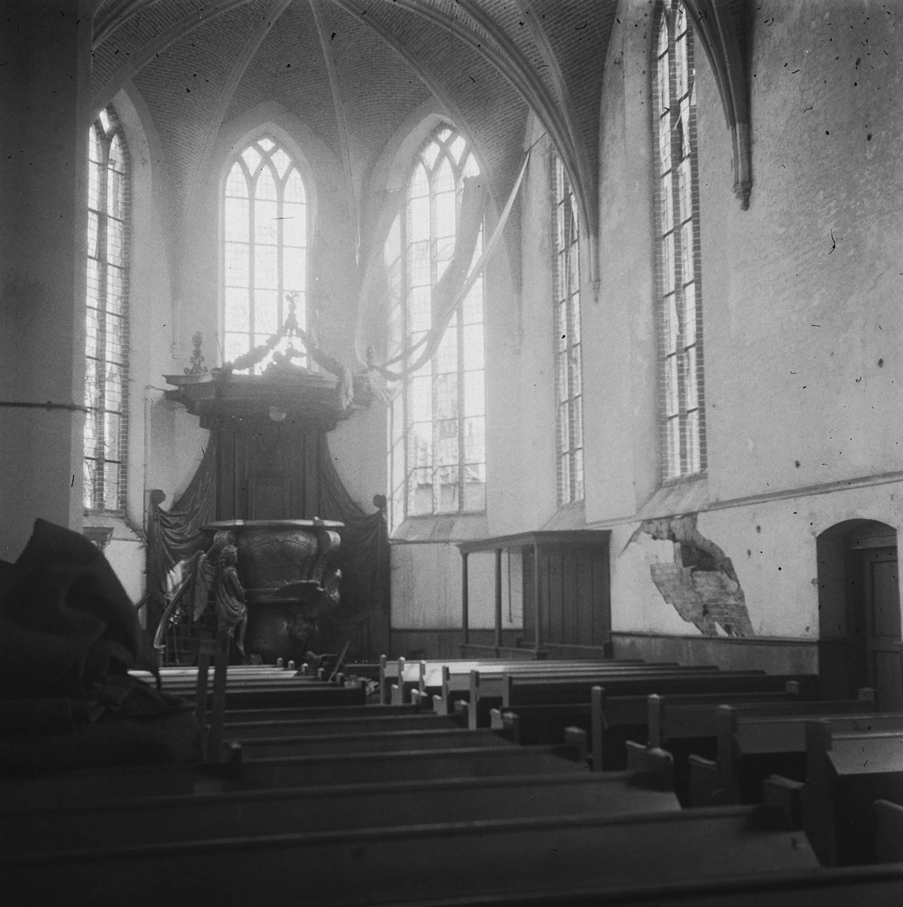 Interieur van een zwaar beschadigde kerk met zicht op de preekstoel Ned. Herv. kerk te Driel