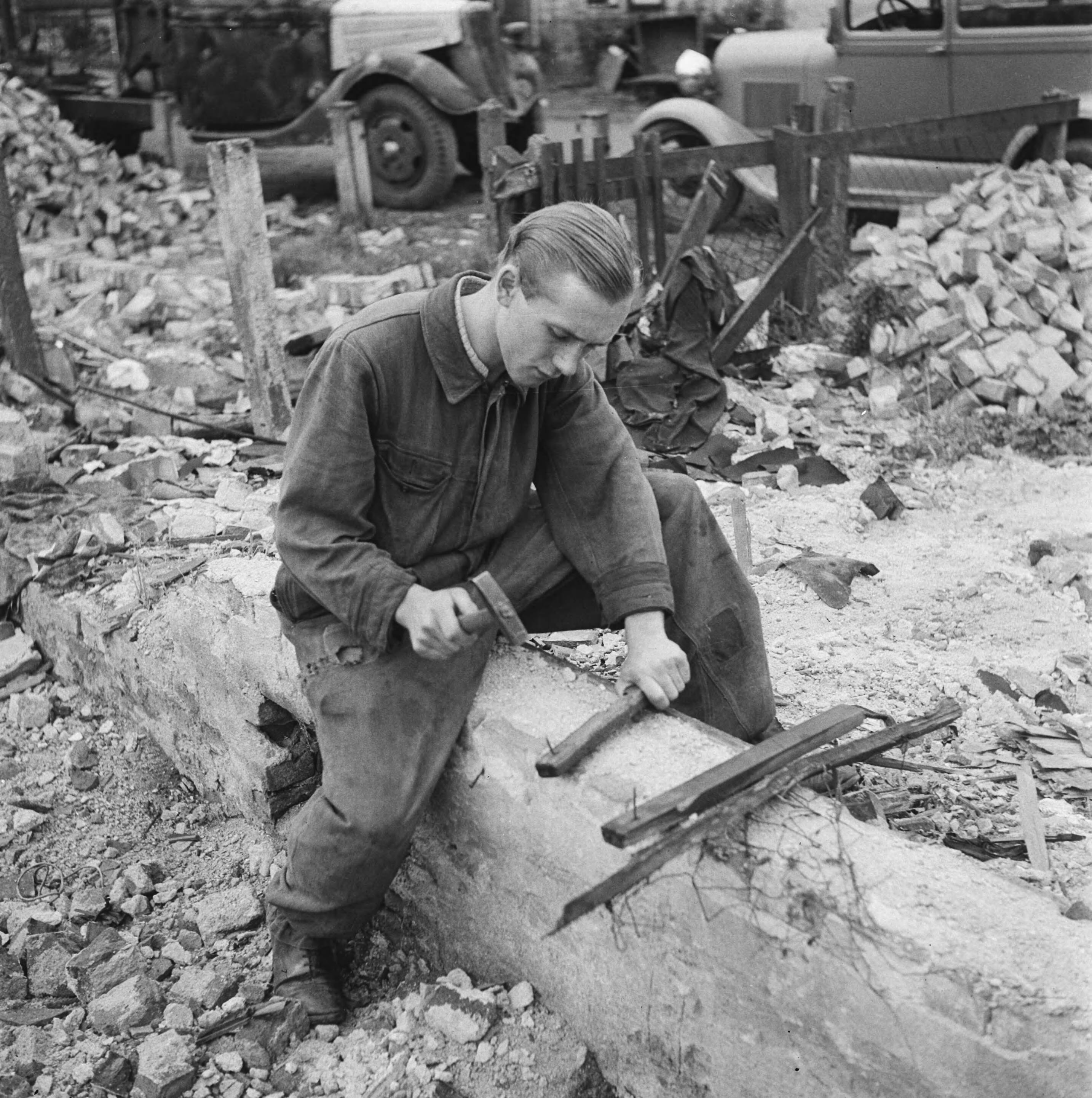 Een jongeman in overall timmert met een hamer een spijker in een oud stuk hout