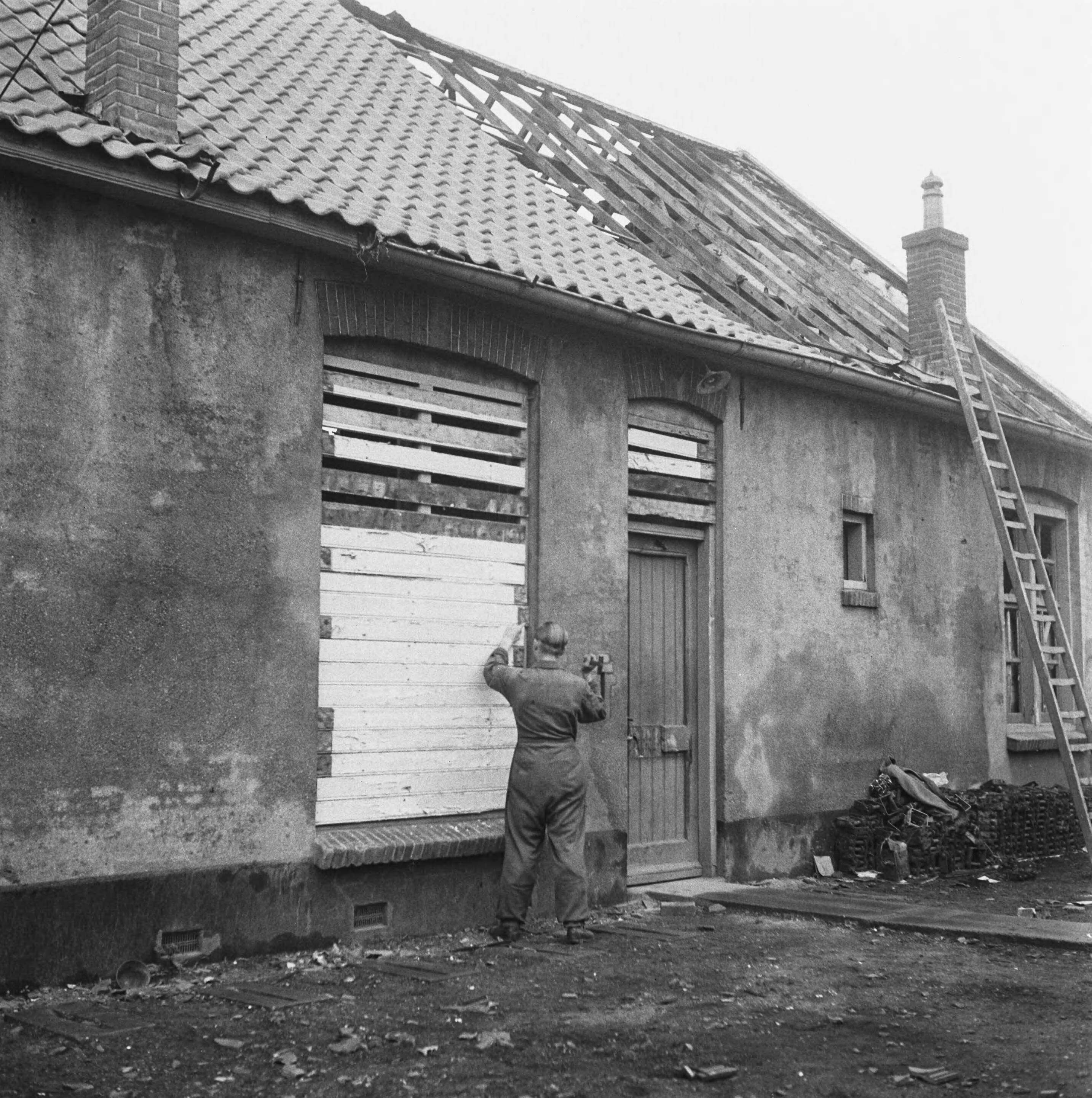 een man in overall timmert een groot raam van een woning dicht met planken, Rechts staat een trap tegen een dak waarvan de dakpannen ontbreken. Links zijn nieuwe dakpannen gelegd