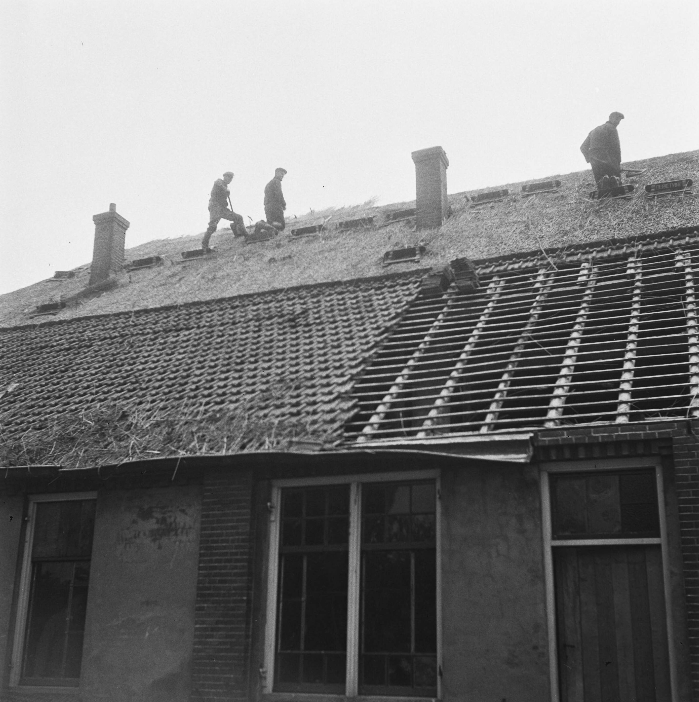 Rietdekkers bezig met het dak van een huis. Rechts ontbreken dakpannen