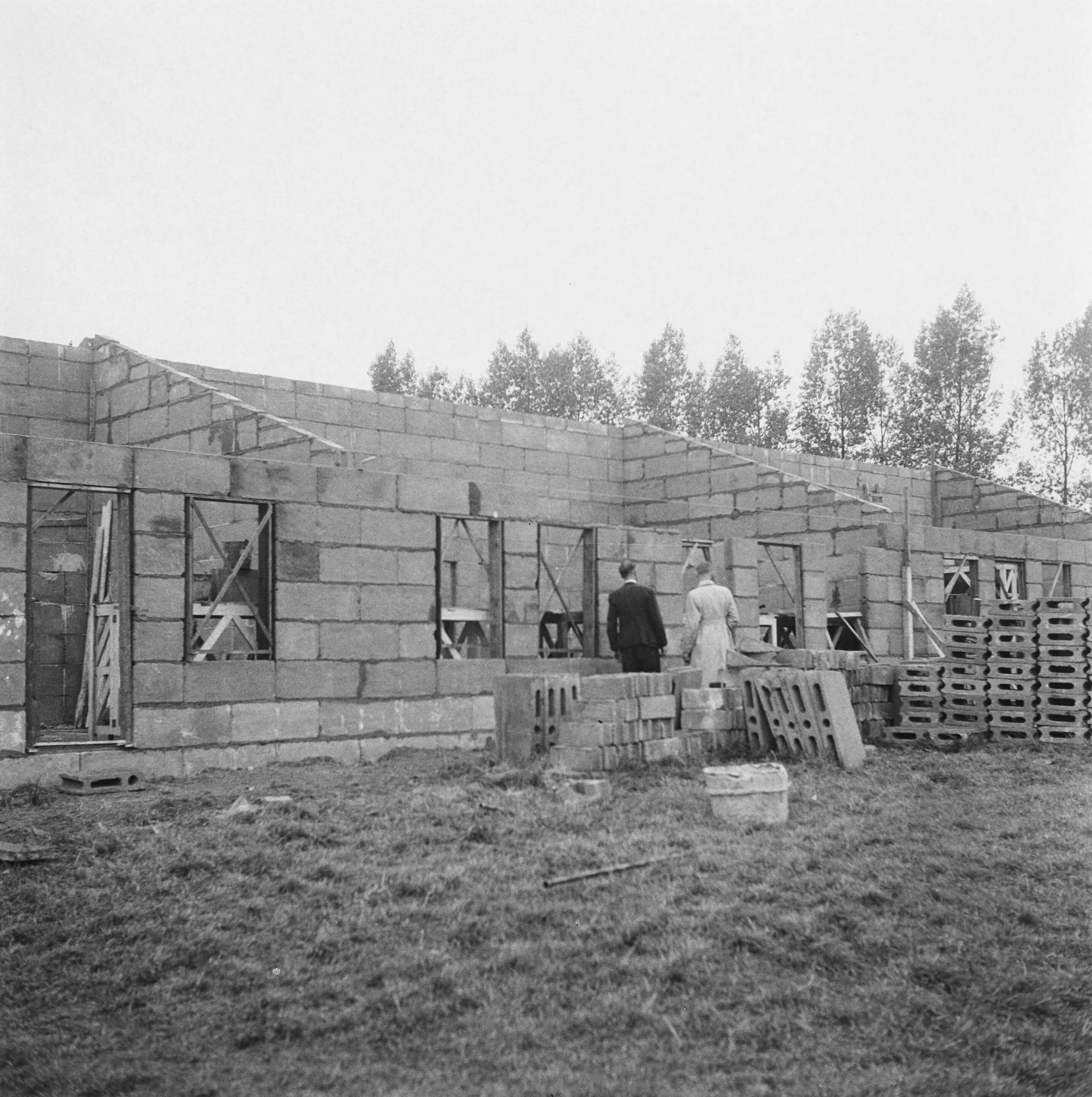 Bouw van noodwoningen met gebruikmaking van betonblokken. Twee bouwkundigen of architecten bekijken het resultaat
