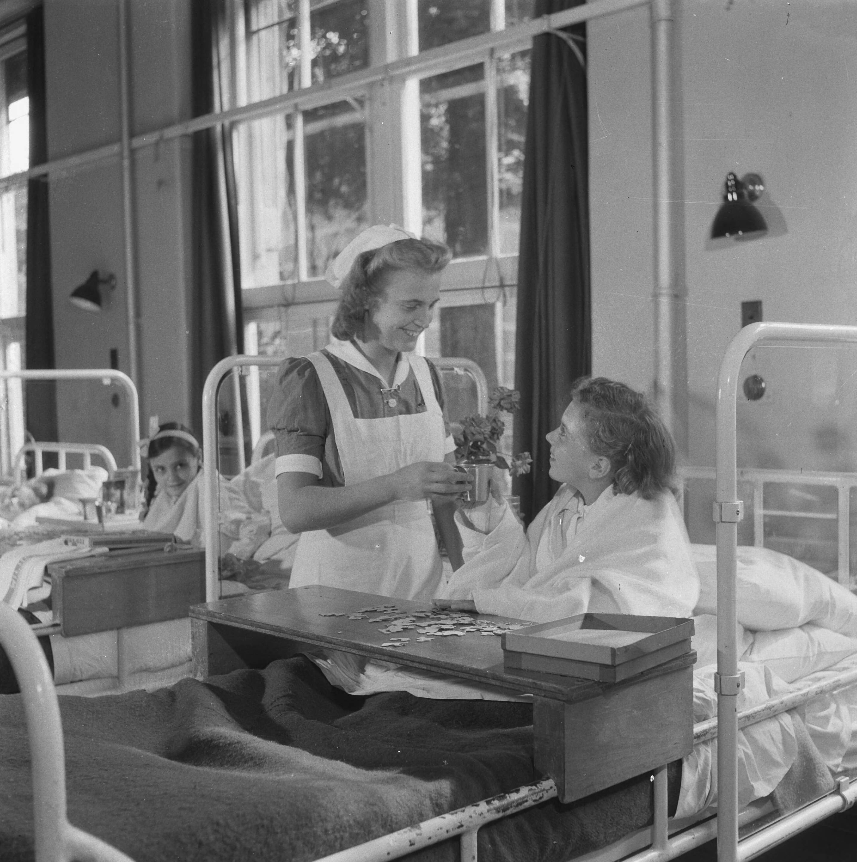 Een leerling-verpleegster ontvangt of geeft een potje met een plant van of aan een patiëntje