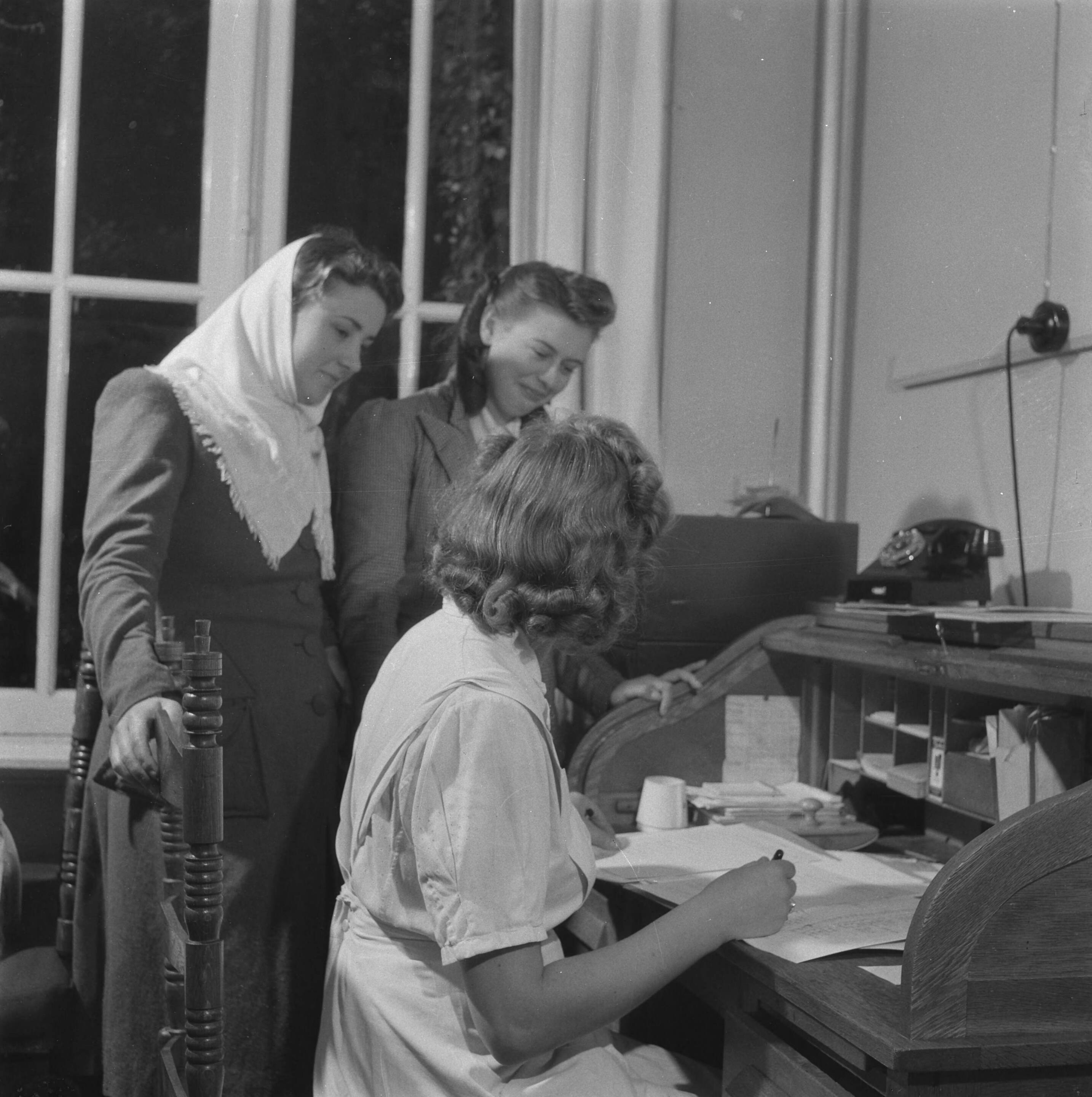 Een verpleegkundige is bezig met de administratie, terwijl twee collega's in burgerkleding toekijken