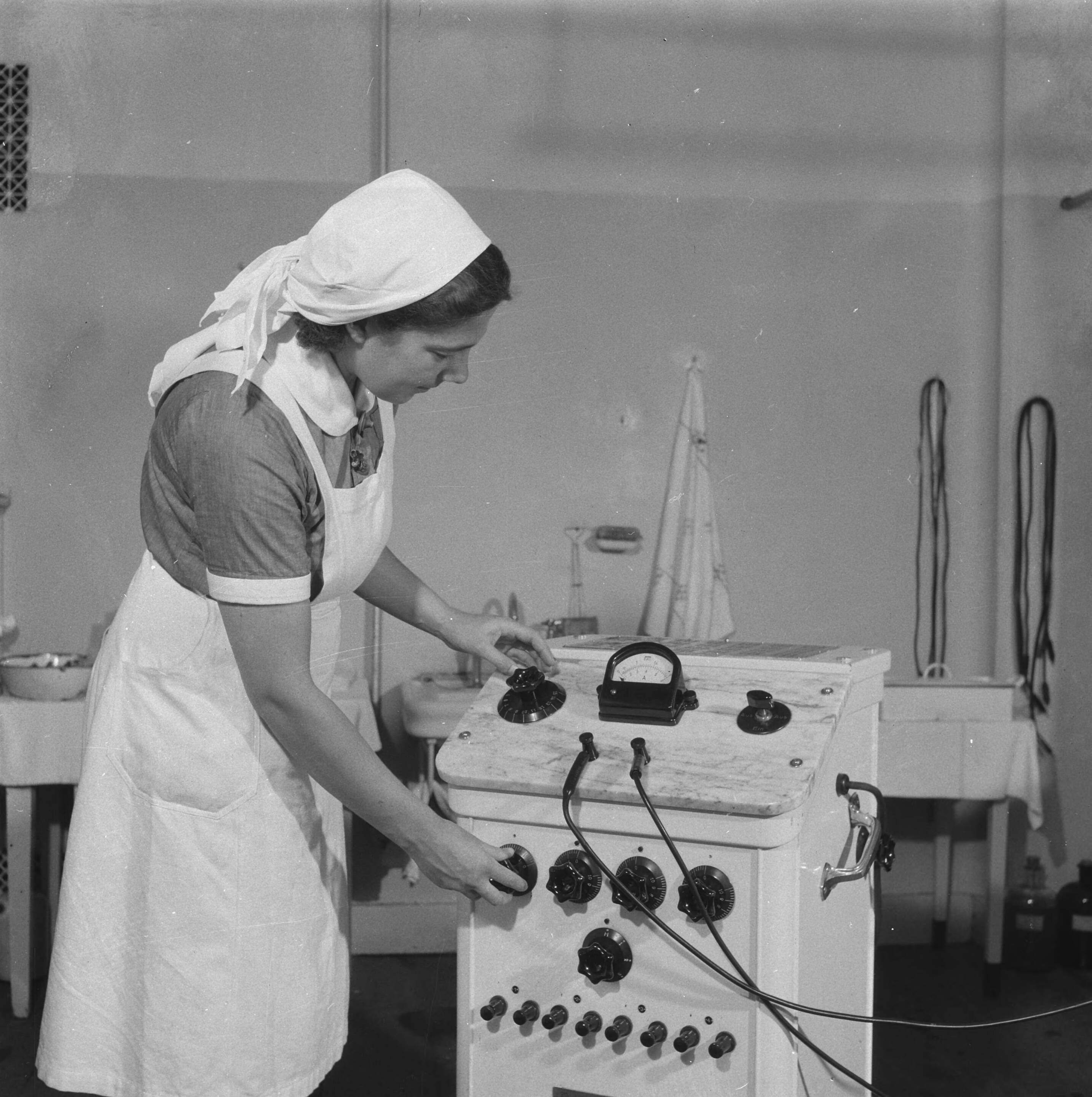 Een verpleegkundige bedient een medisch apparaat
