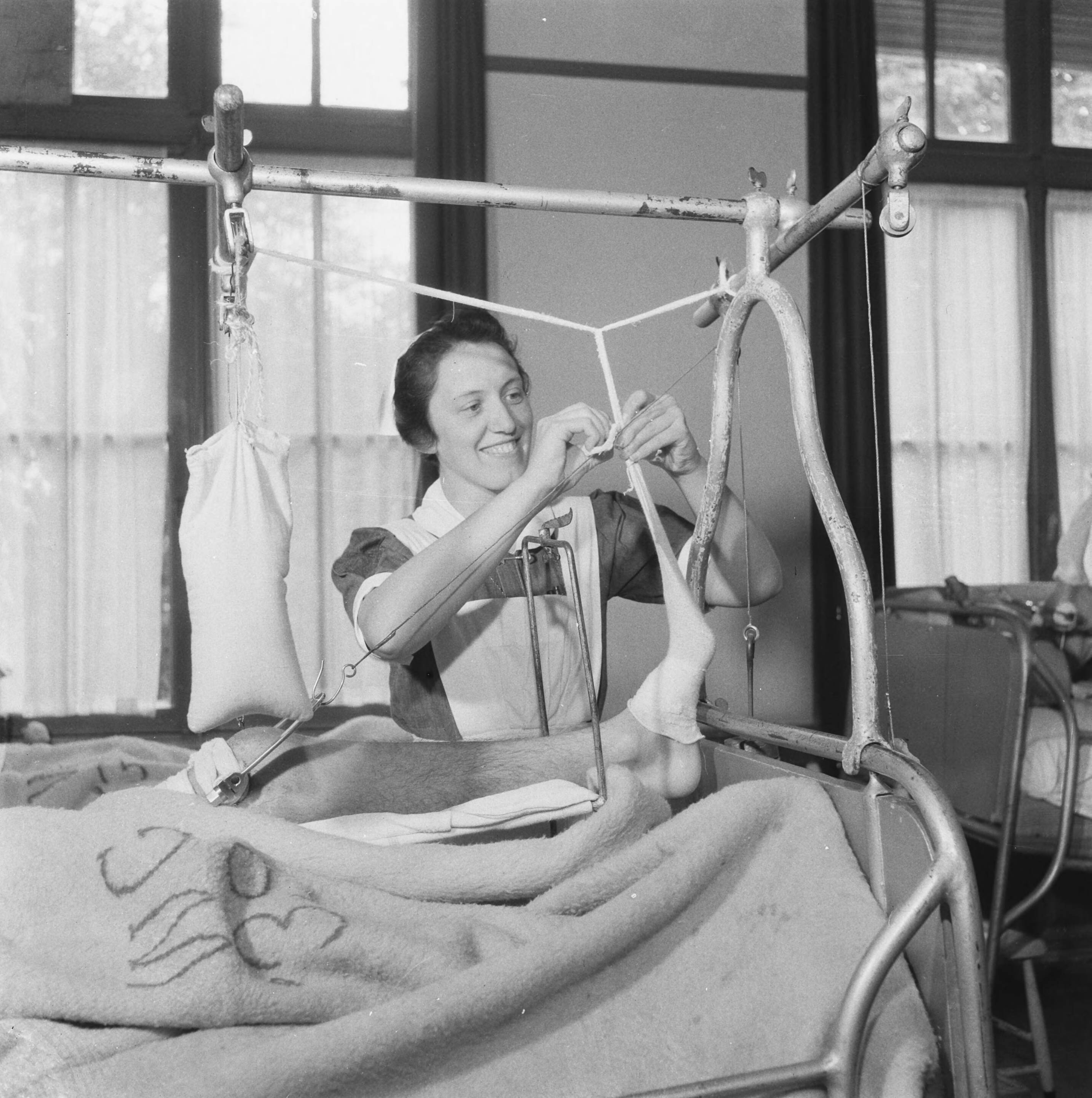 Een vrolijk lachende verpleegster is bezig met de stellage die het been en de voet van een patiënt hoog houdt