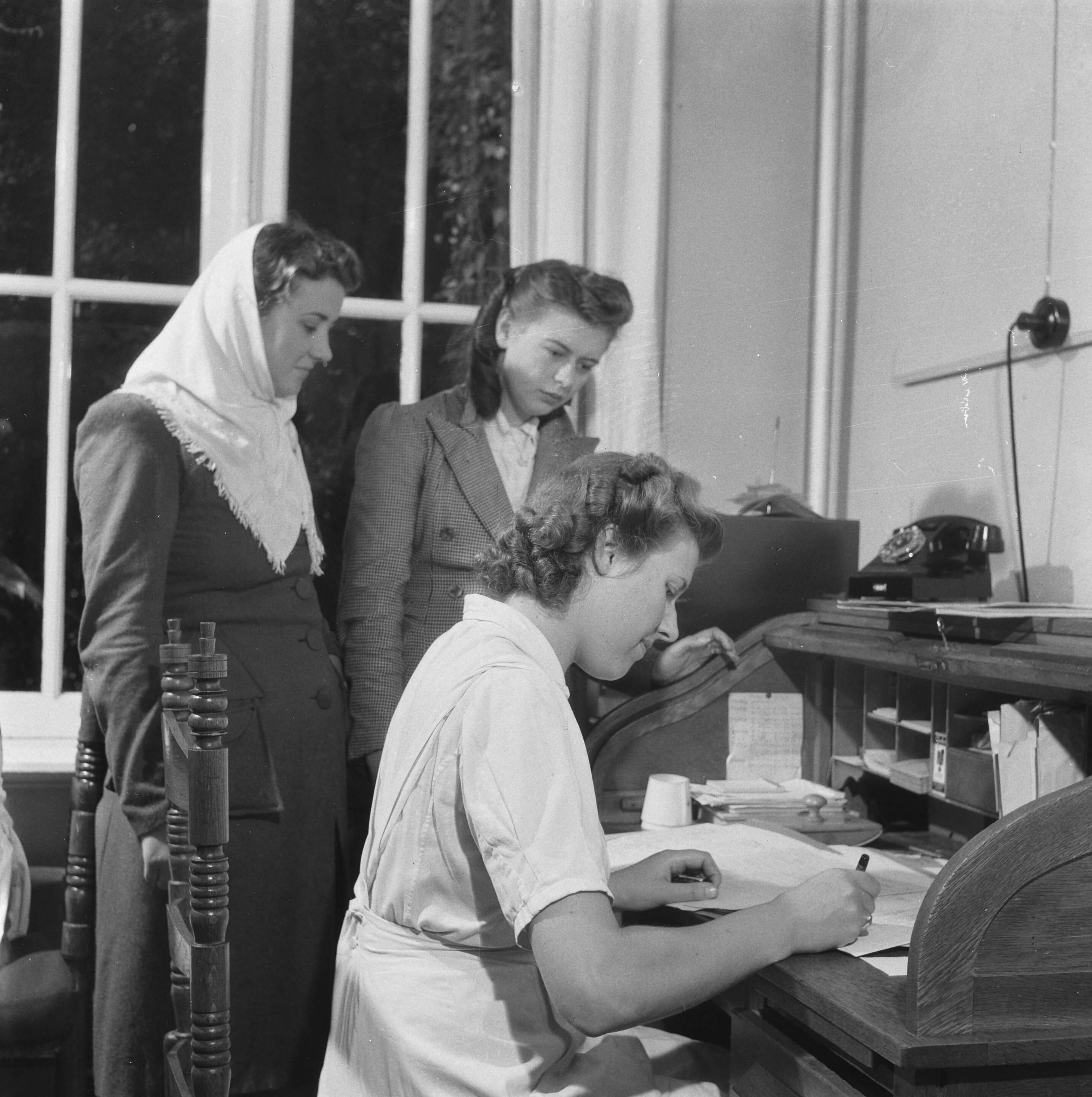 Een verpleegkundige is bezig met de administratie, terwijl twee collega's in burgerkleding toekijken