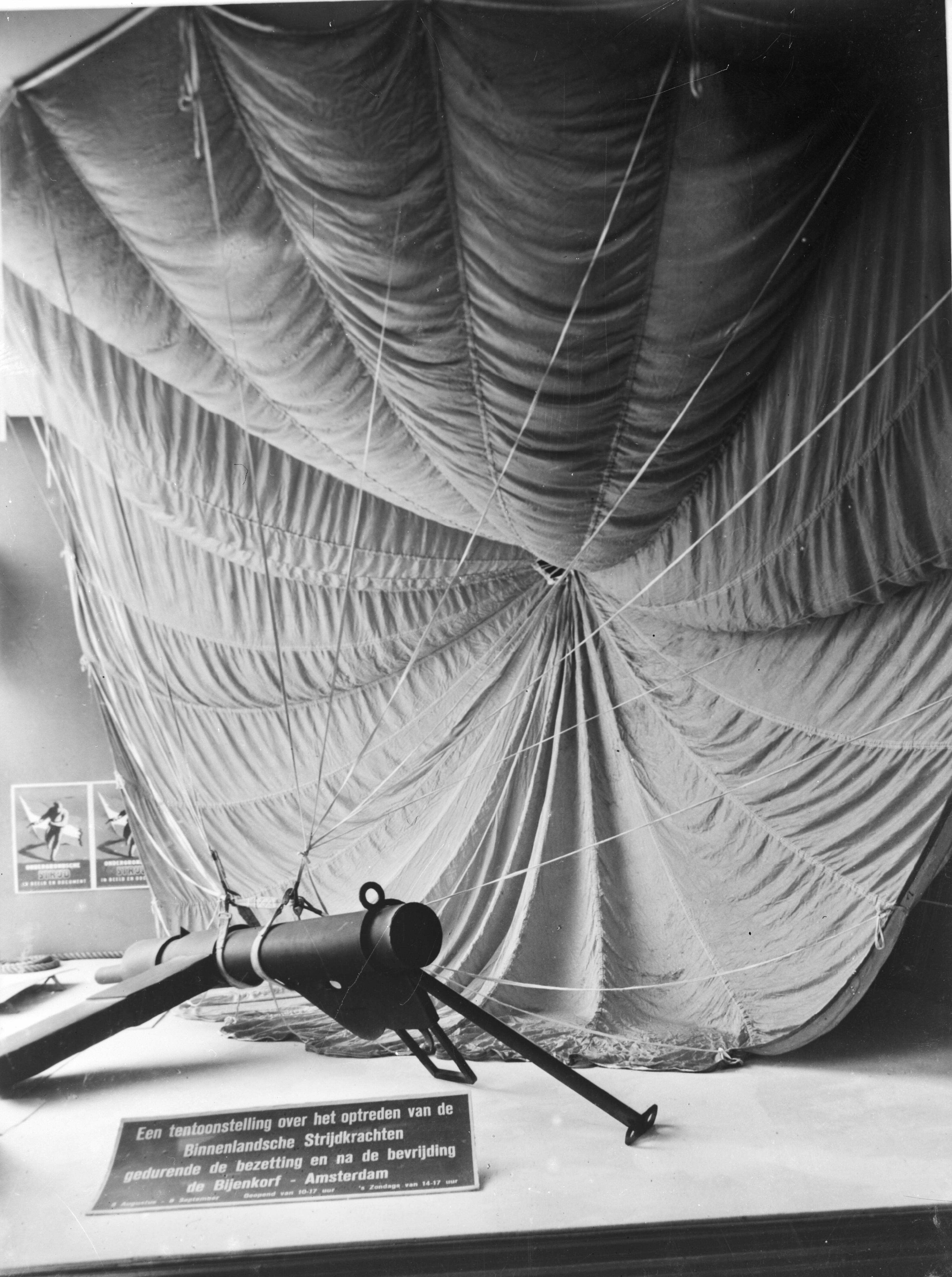 Een gedropt machinegeweer, Bevestigd aan een parachute om het voor schade te behoeden valt het machinegeweer uit de lucht.