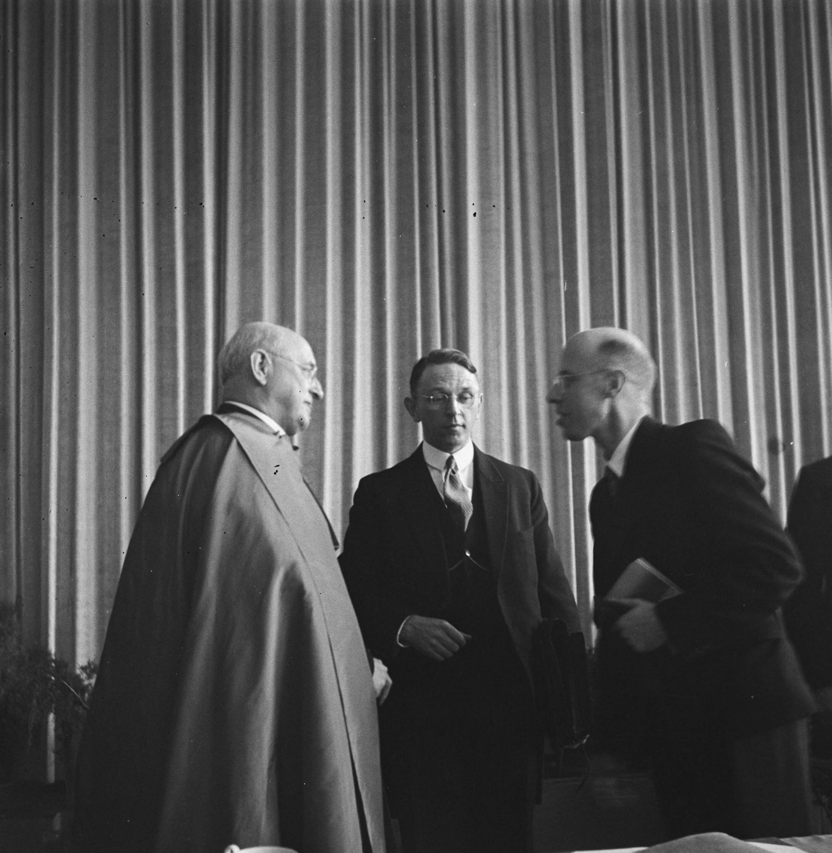 Congres van de Katholieke Actie te Utrecht. In gesprek vlnr. vicaris-generaal mgr. D. Huurdeman, dr. ir. F. Ph. A. Tellegen en minister-president L.J.M. Beel