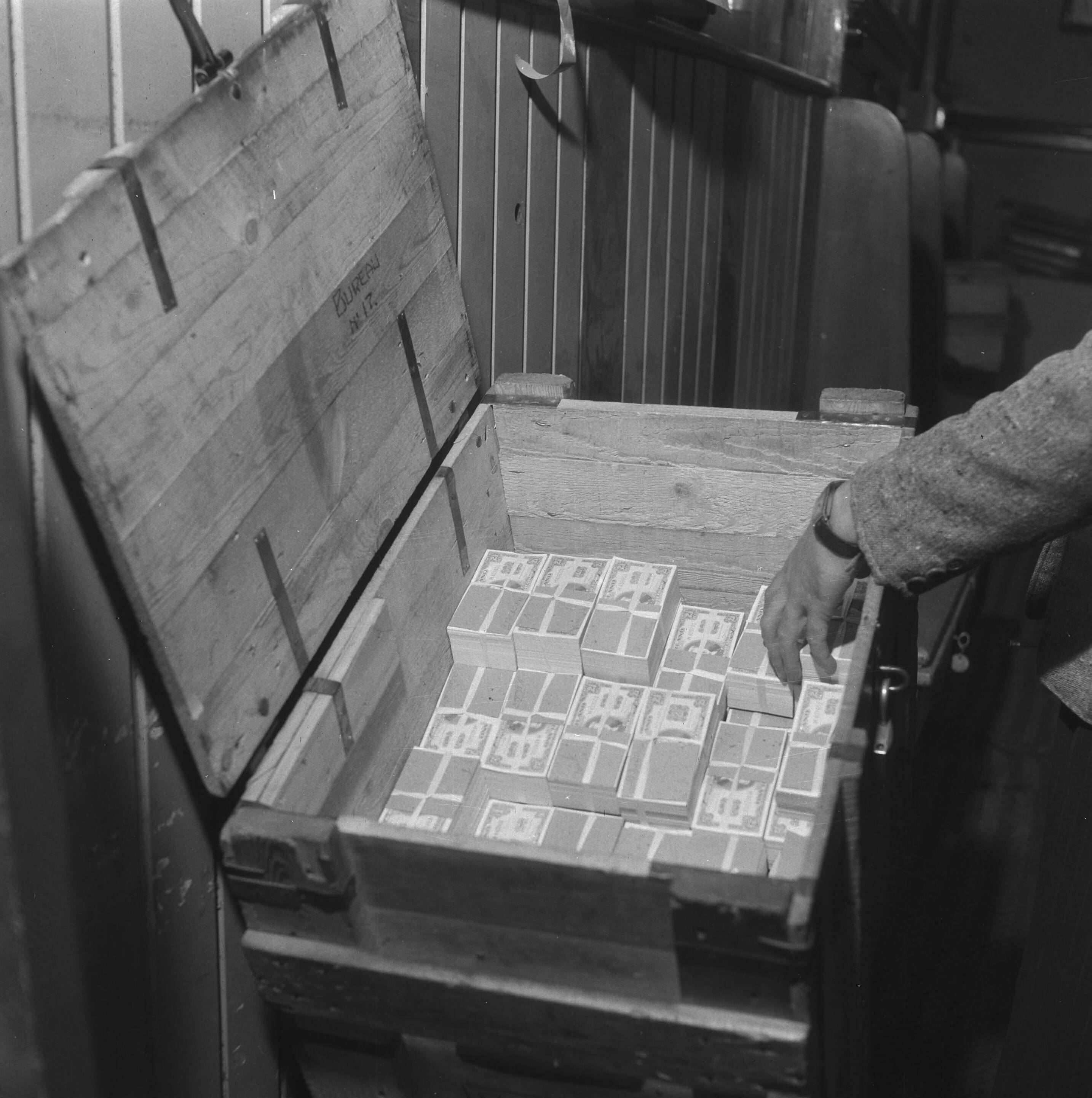Geldzuivering. Kist met stapels nieuwe bankbiljetten