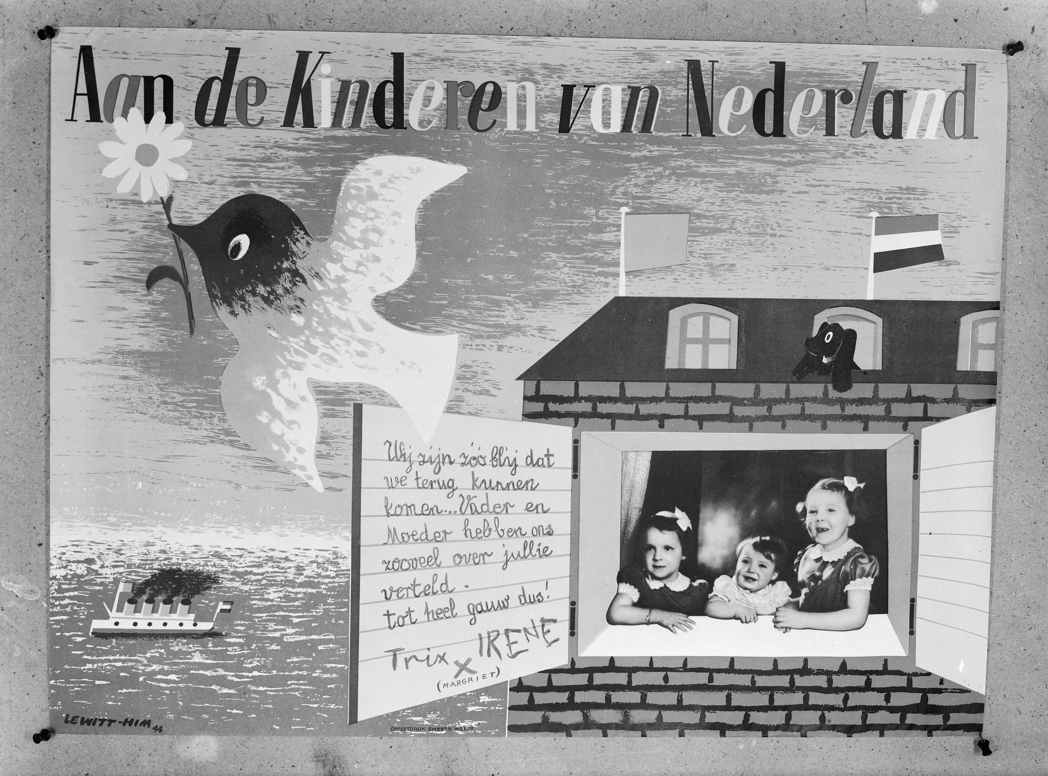 Affiche Rijksvoorlichtingsdienst. De drie prinsesjes met wens om gauw naar het vaderland terug te keren