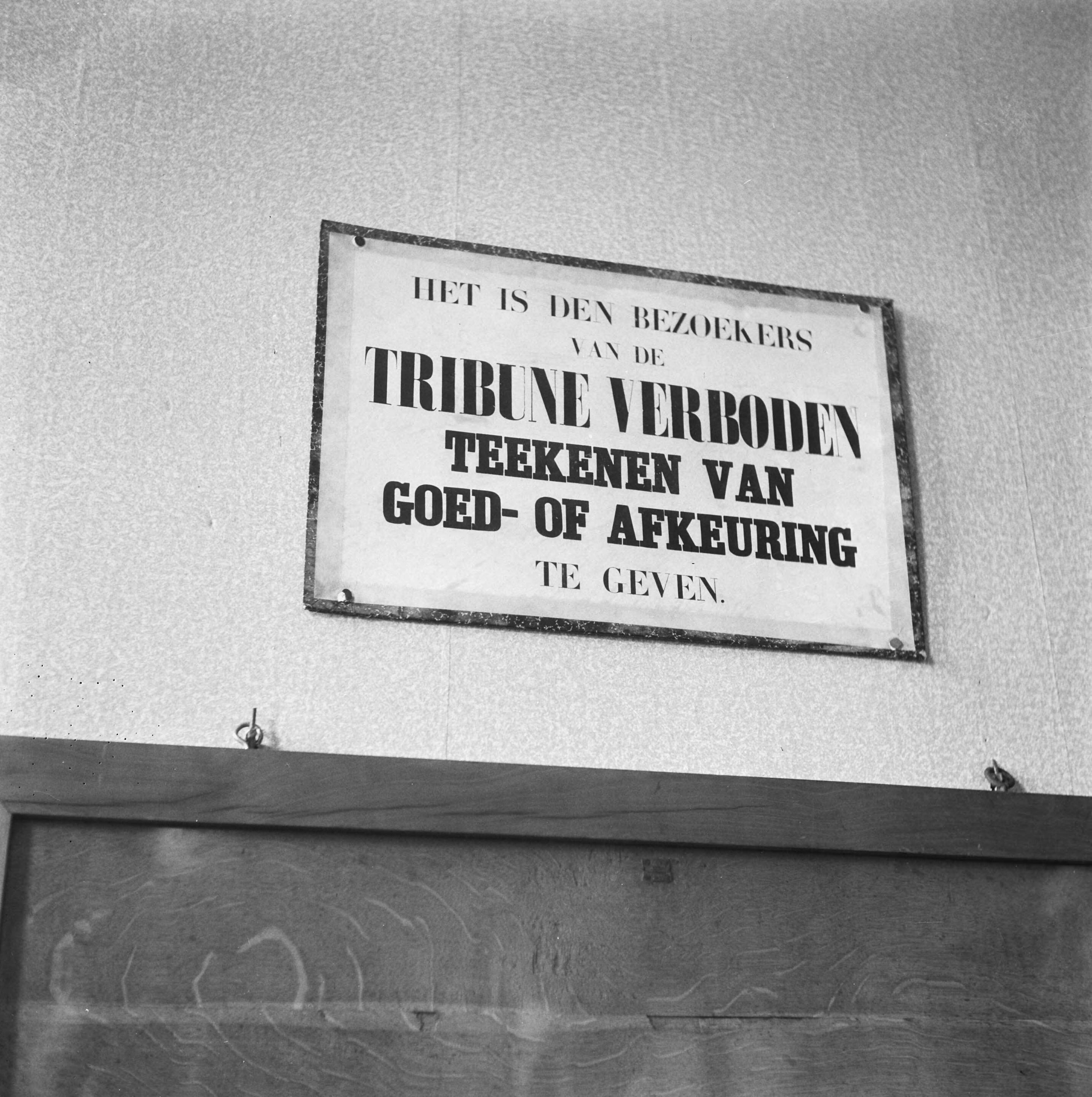 Binnenhof te Den Haag. Tweede Kamer. Bordje met tekst "Het is de bezoekers van de tribune verboden teekenen van goed- of afkeuring te geven"