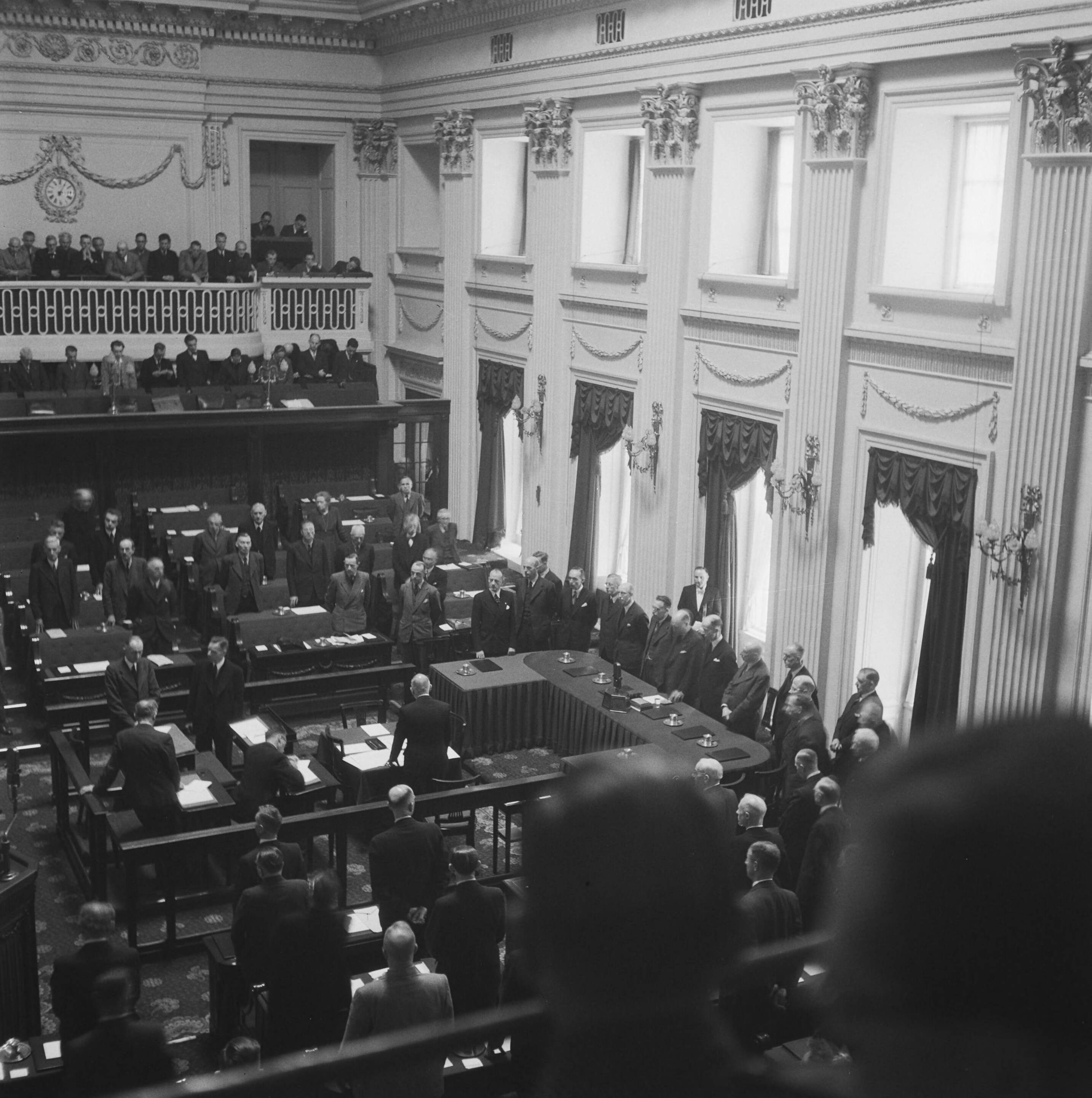 Binnenhof te Den Haag. Tweede Kamer. Overzicht van de zittingszaal, leden en bezoekers staan