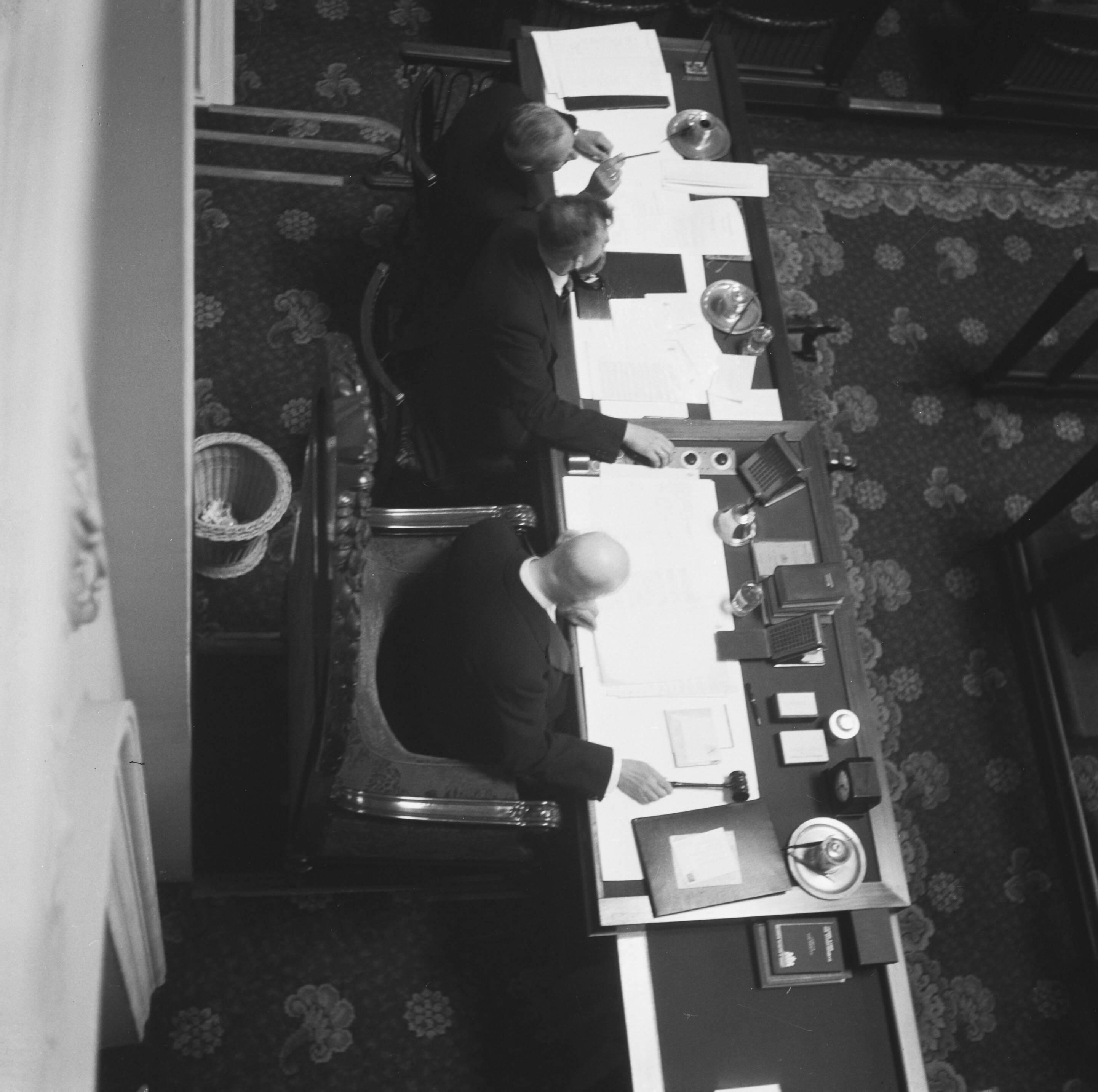 Binnenhof te Den Haag. Tweede Kamer. Overzicht van de zittingszaal, voorzitter en griffier van boven gezien