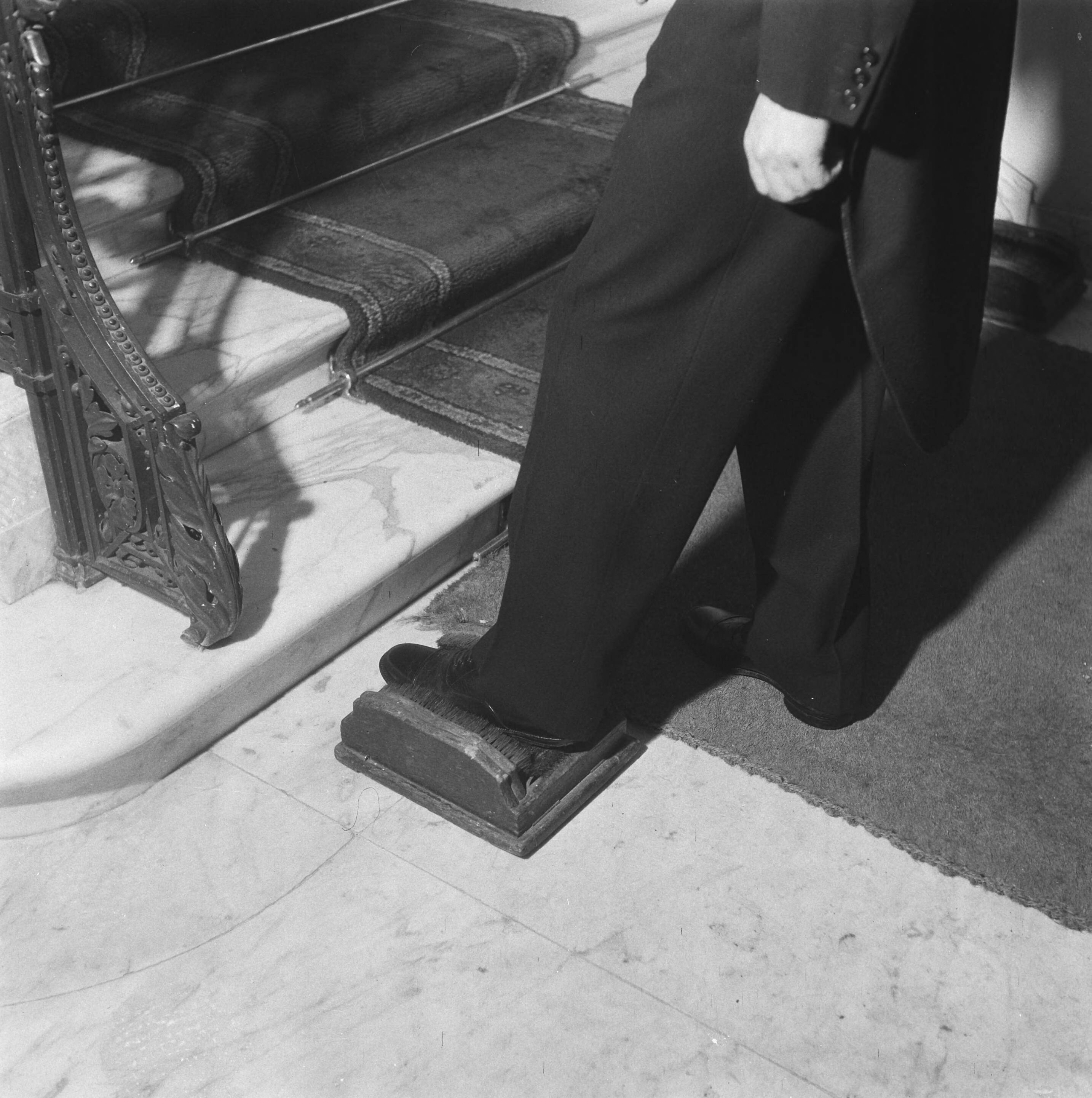 Binnenhof Den Haag. Tweede Kamer. Schoonmaakborstel voor schoenen voor een trap