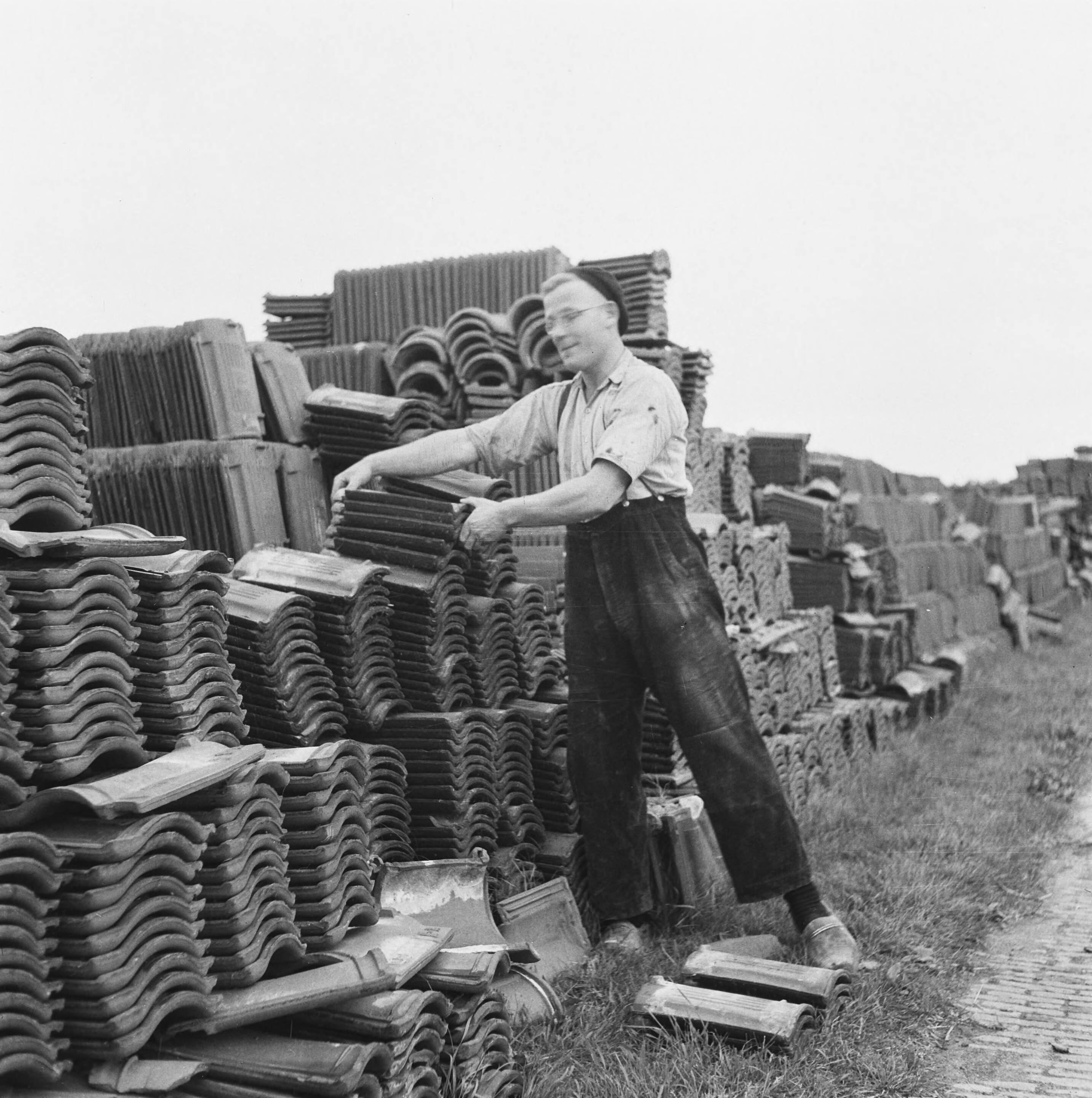 Drooglegging van de Wieringermeerpolder. Man bij stapels bakstenen