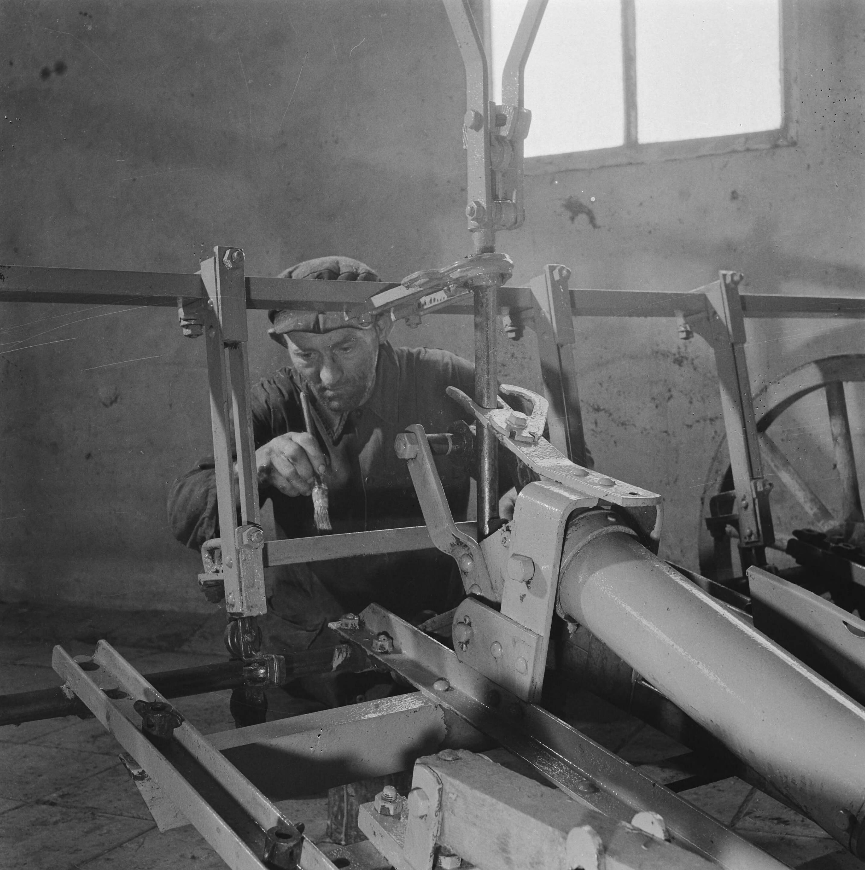 Drooglegging van de Wieringermeerpolder. Boer schildert landbouwwerktuig