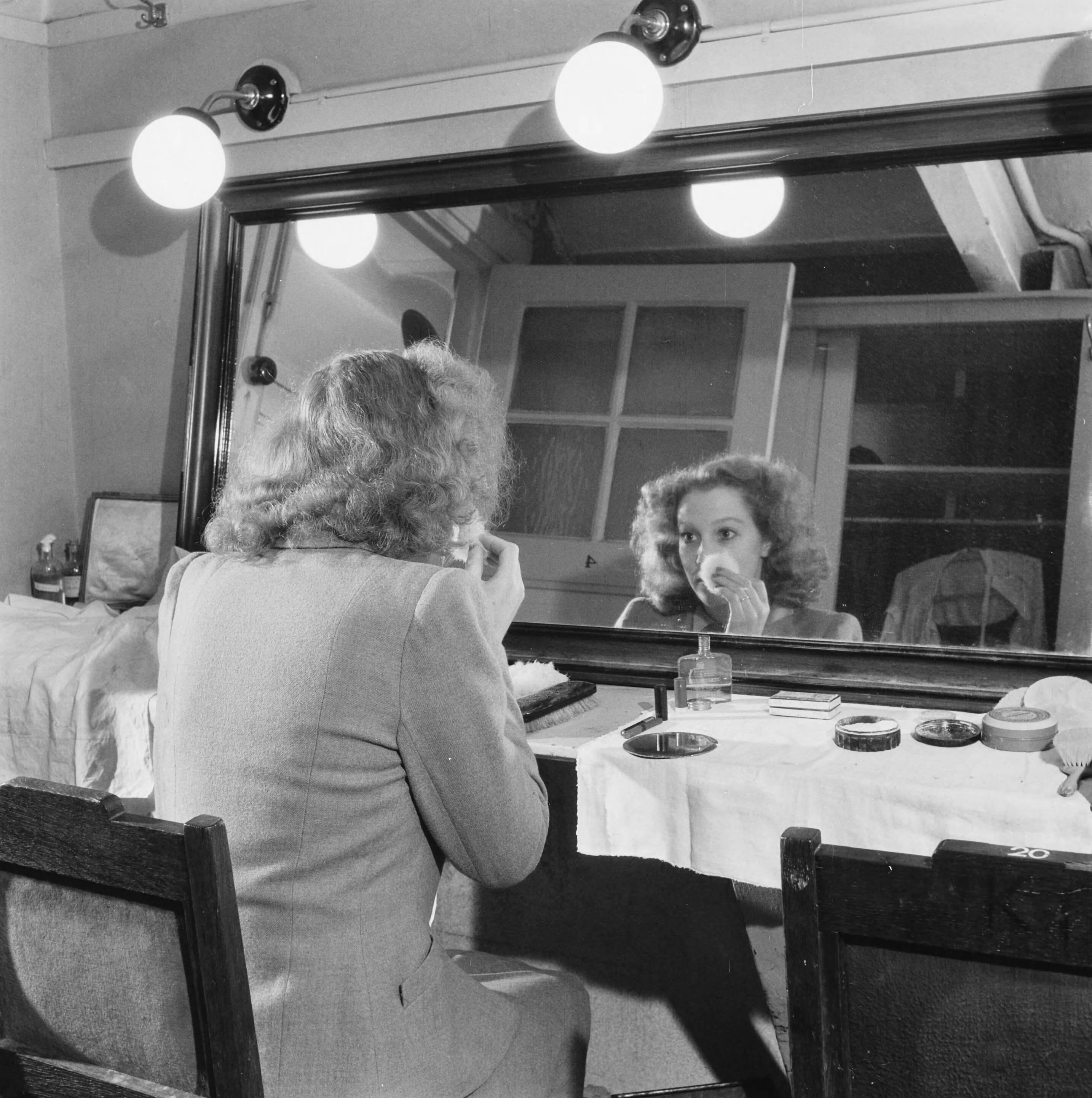 Toneelrepetitie. Actrice poedert zich voor spiegel