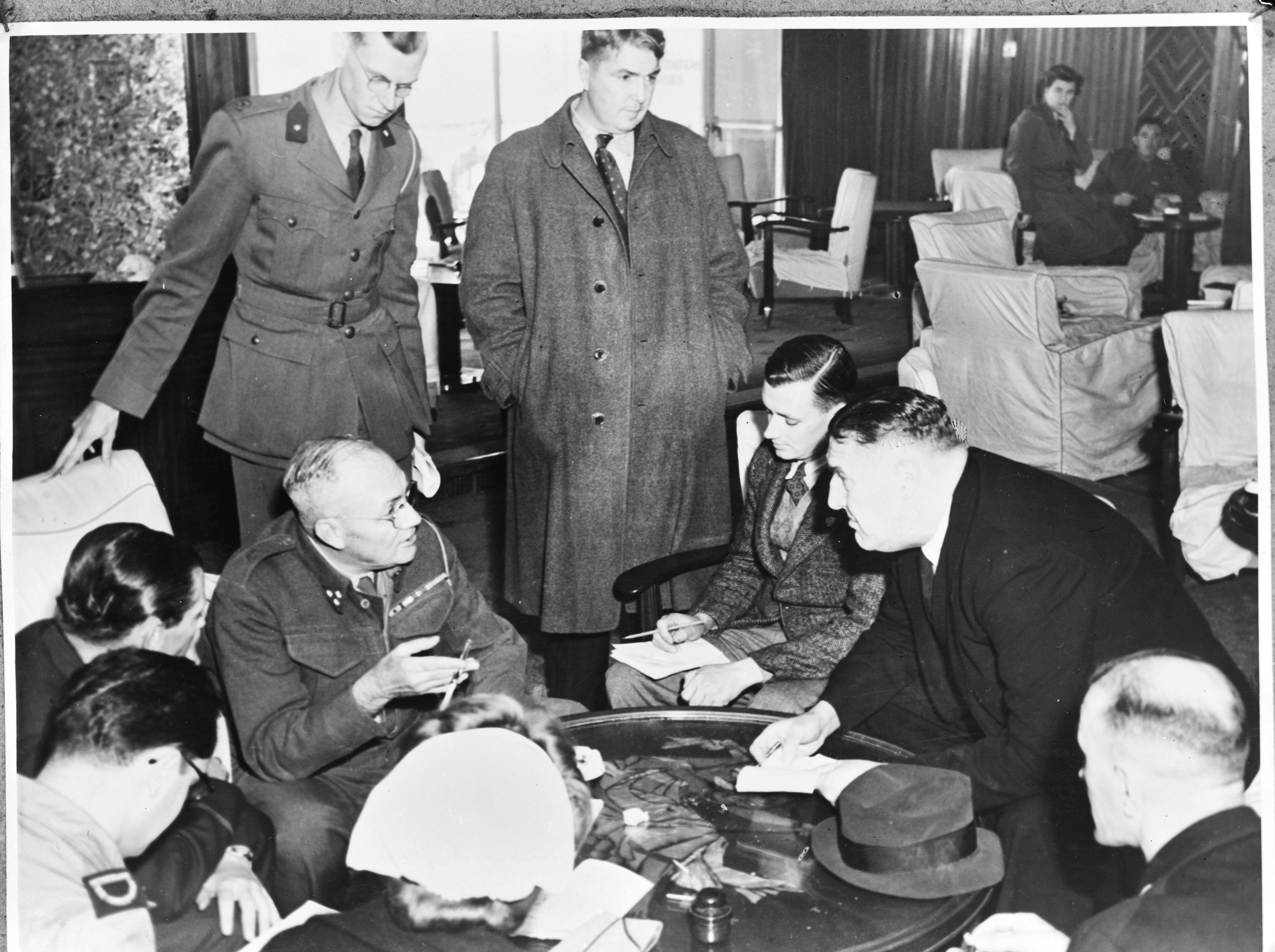 Hospitaalschip Oranje. Kapitein-arts? geeft uitleg aan journalisten in lounge