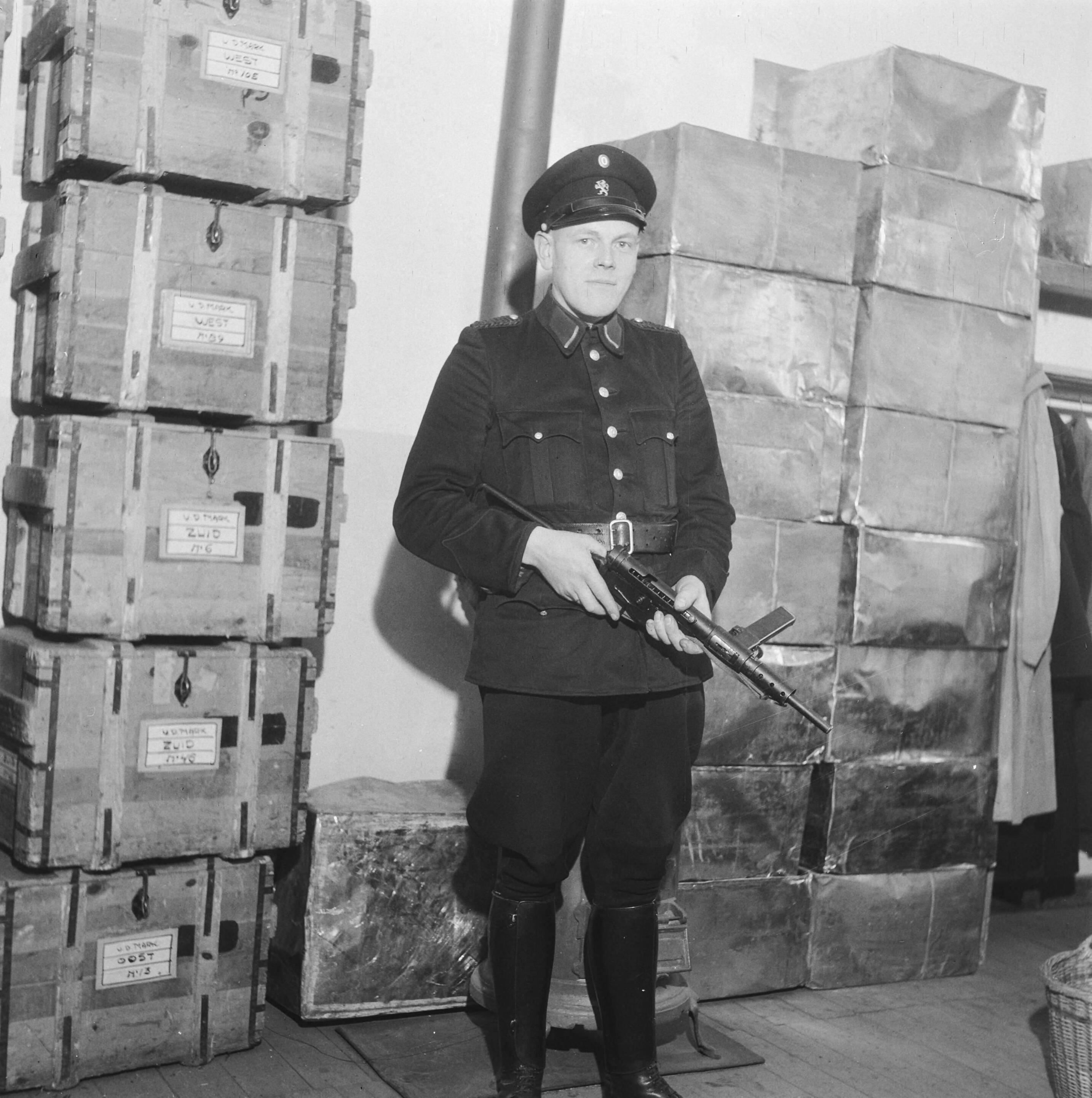 Politieman met stengun voor een aantal kisten