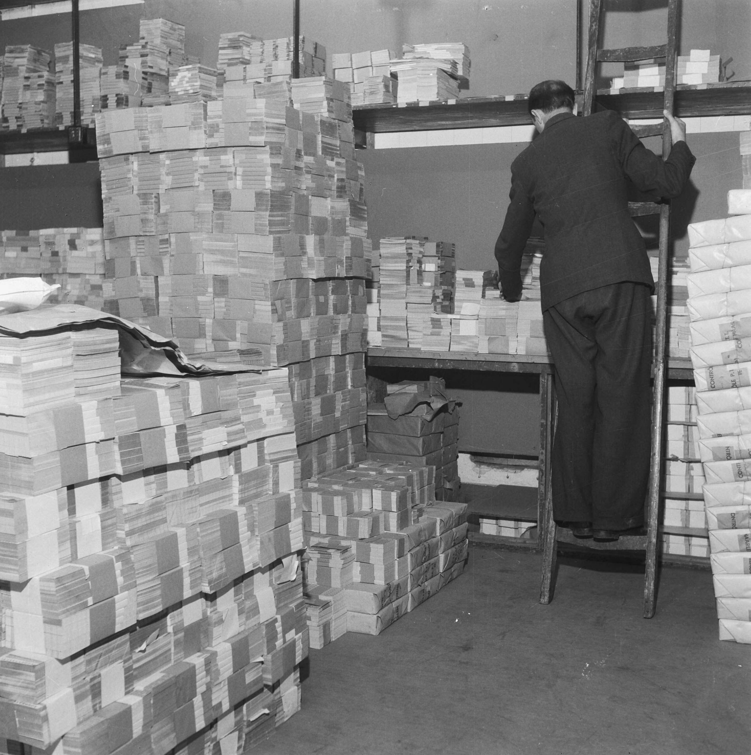Geldzuivering. Man staat op ladder in een bergruimte met stapels bankbiljetten