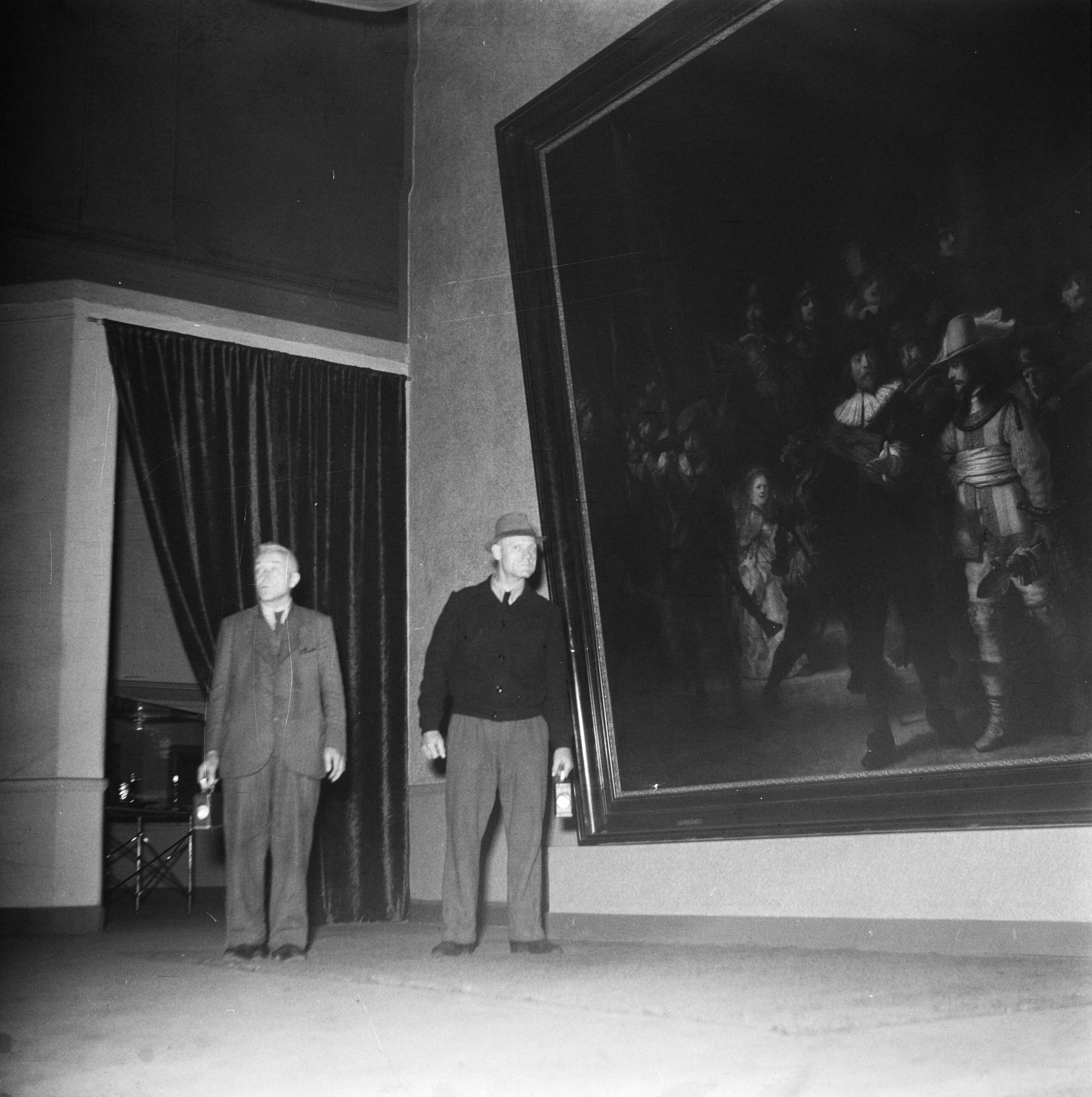 Nachtwakers doen hun ronde. Hier staan ze bij de Nachtwacht