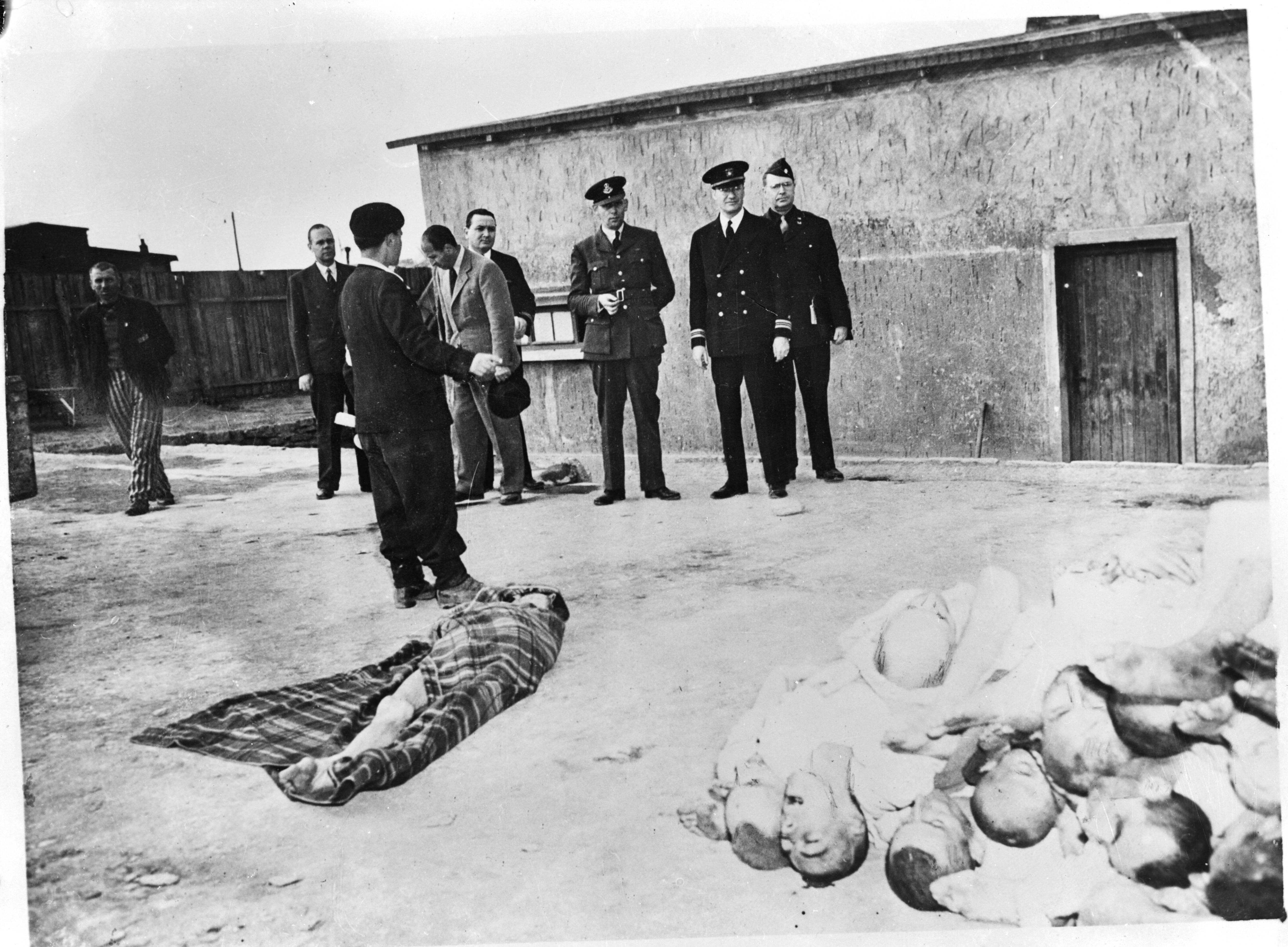 Geallieerde militairen en mannen in burgerkleding bekijken lijken